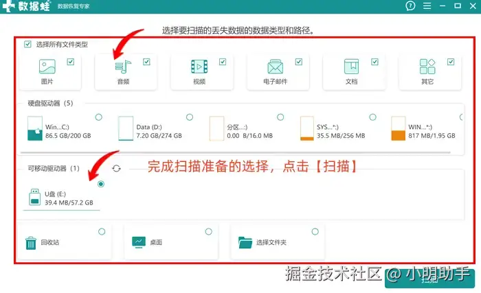 步骤1: 打开软件进入首页,在上面选择目标文件的类型和扫描位置(建议扫描U盘),点击【导出】按钮;