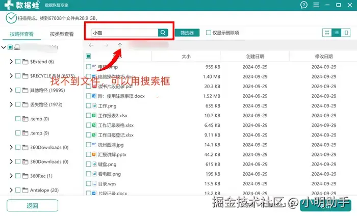 步骤2: 等待扫描文件显示完成后,我们可以选择使用上方的【搜索框】提高效率,更快地找到目标文件。找到文件后点击【导出】,在小窗选择文件保存位置,完成数据恢复。
