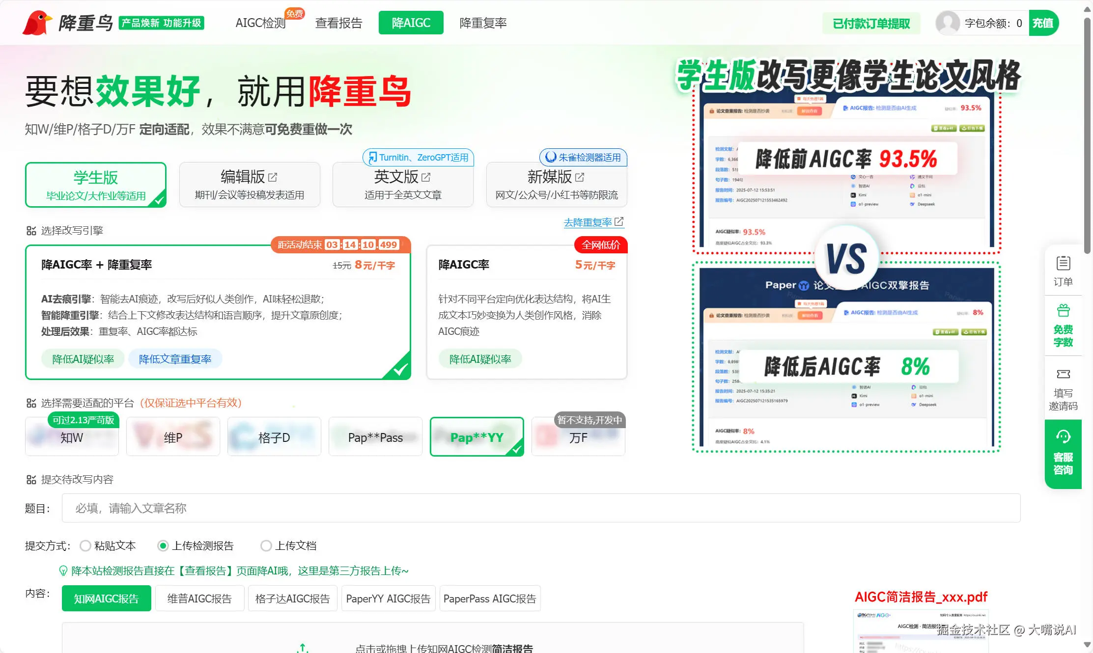 先来说说降重鸟,这可真是个让人眼前一亮的降AIGC工具。它在目前一众降AIGC工具里,那效果堪称一绝,要说市场占有率,估计也是一骑绝尘,使用人数多得很。它支持中文和英文的降AIGC以及降重操作,简直不要太贴心。而且在选择降AI的平台方面,常见的知网、维普、格子达、Tuinitin等平台,它都能完美适配,对于PaperPass、PaperYY这类第三方平台,也有着良好的支持。