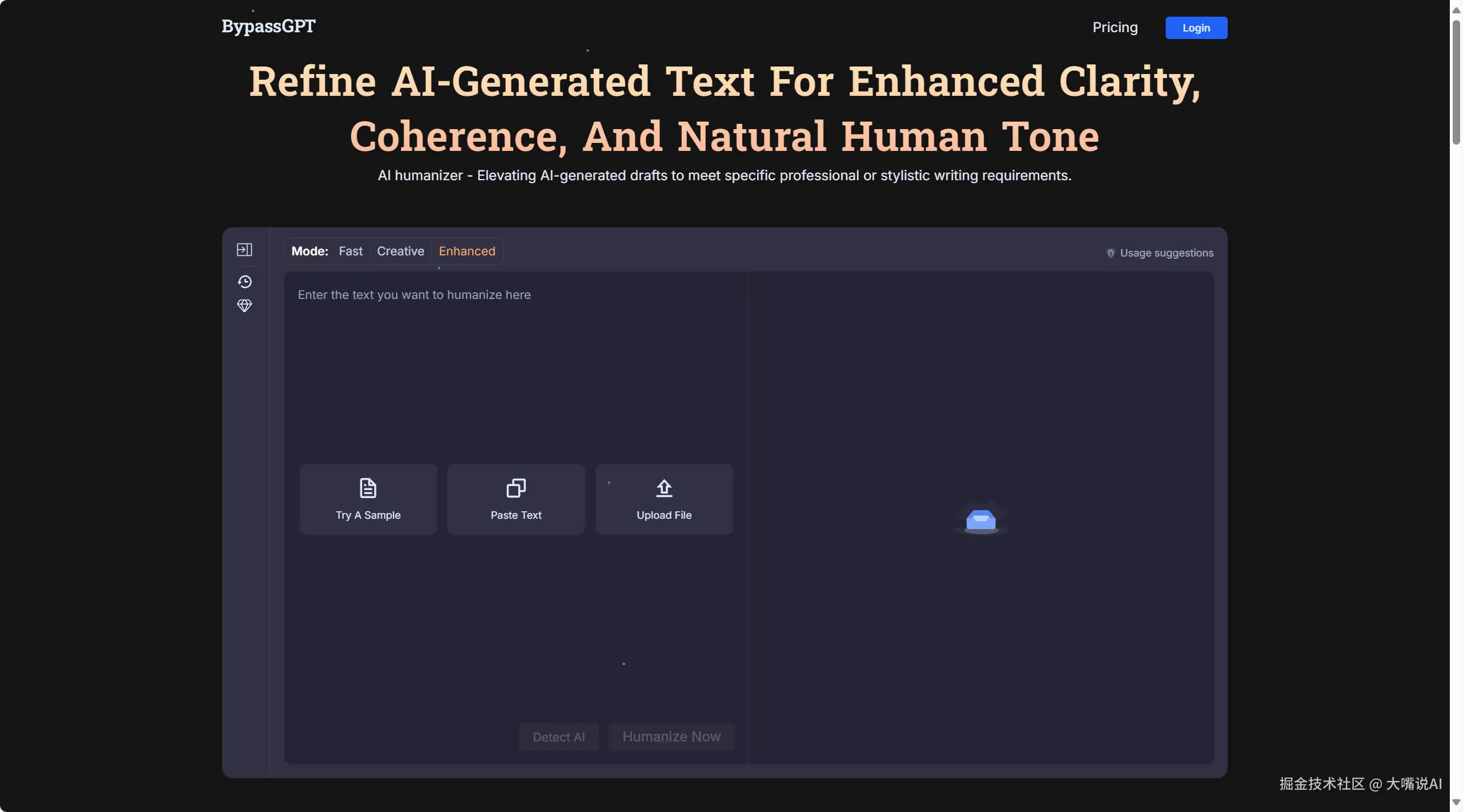 BypassGPT同样是一款AI文本转化工具,它能将AI生成的内容转变为自然、类似人类写作风格的文本,有效绕过各类AI检测工具。它的先进算法在保持原文含义和语境的同时,还能优化语法、句子结构和措辞,让文本不仅流畅,而且难以被识别为AI创作的,可谓是相当厉害。