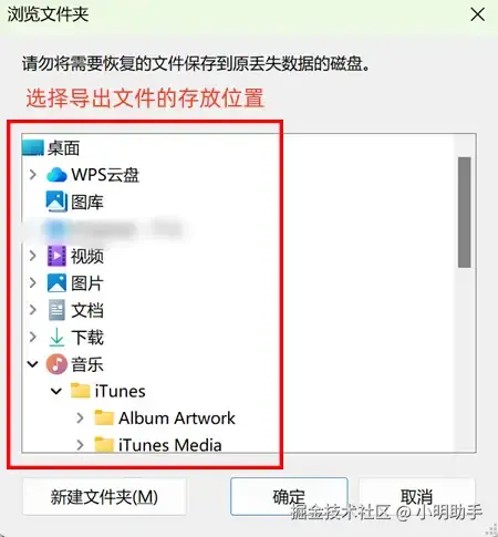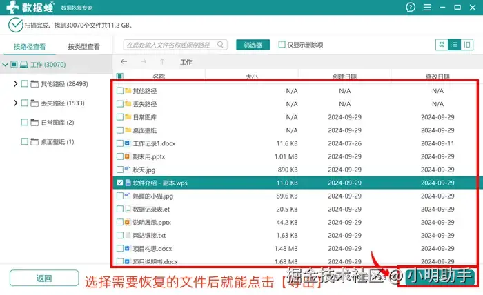 步骤2: 在扫描出来的文件中勾选目标文件,点击【导出】按钮就能唤起【浏览文件夹】小窗;