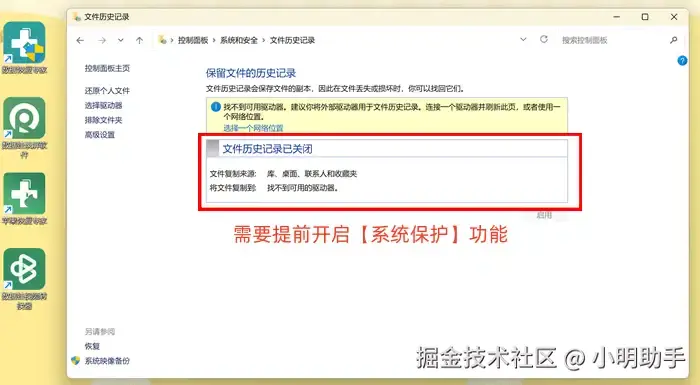 如果用户提前开启了【系统保护】功能,那么就能开启【文件历史记录】,并尝试进行磁盘数据恢复。把磁盘删除了怎么恢复?如何找到该工具进行磁盘数据恢复呢?