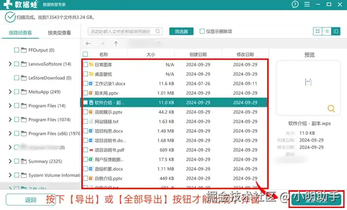 步骤2: 等待软件完成扫描后,我们可以在软件的指定位置选出需要恢复的文件,点击后按下【导出】按钮;