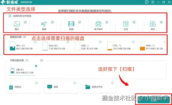 步骤1: 打开软件的首页,在上方选择所需文件的类型,在下一列可以选择需要扫描的磁盘,选好之后再点击【扫描】按钮让扫描工作进程开启;