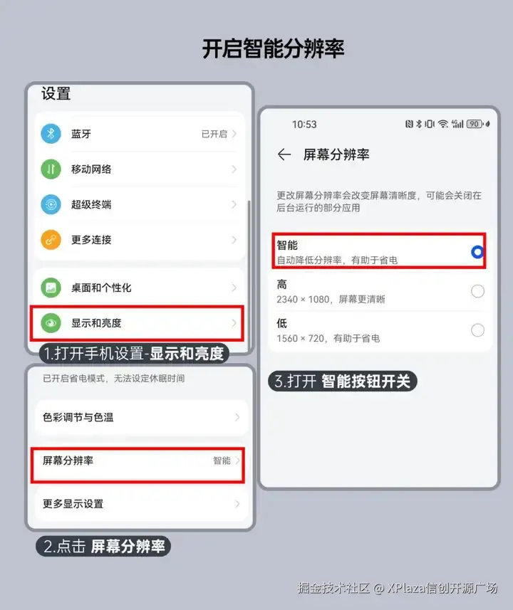 分辨率越高,越费电,电量告急时把高分辨率改为智能分辨率或低分辨率;玩游戏或看视频时,再切换成高分辨率。
