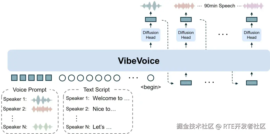 VibeVoice 的关键创新是使用了连续语音分词器(声学和语义),以 7.5 Hz 的超低帧率运行。这在高效保留音频保真度的同时,大幅提升了处理长序列的计算效率。该框架结合了 LLM(用于理解文本上下文和对话流)和扩散头部(用于生成高保真声学细节),构建了下一代代币扩散模型。