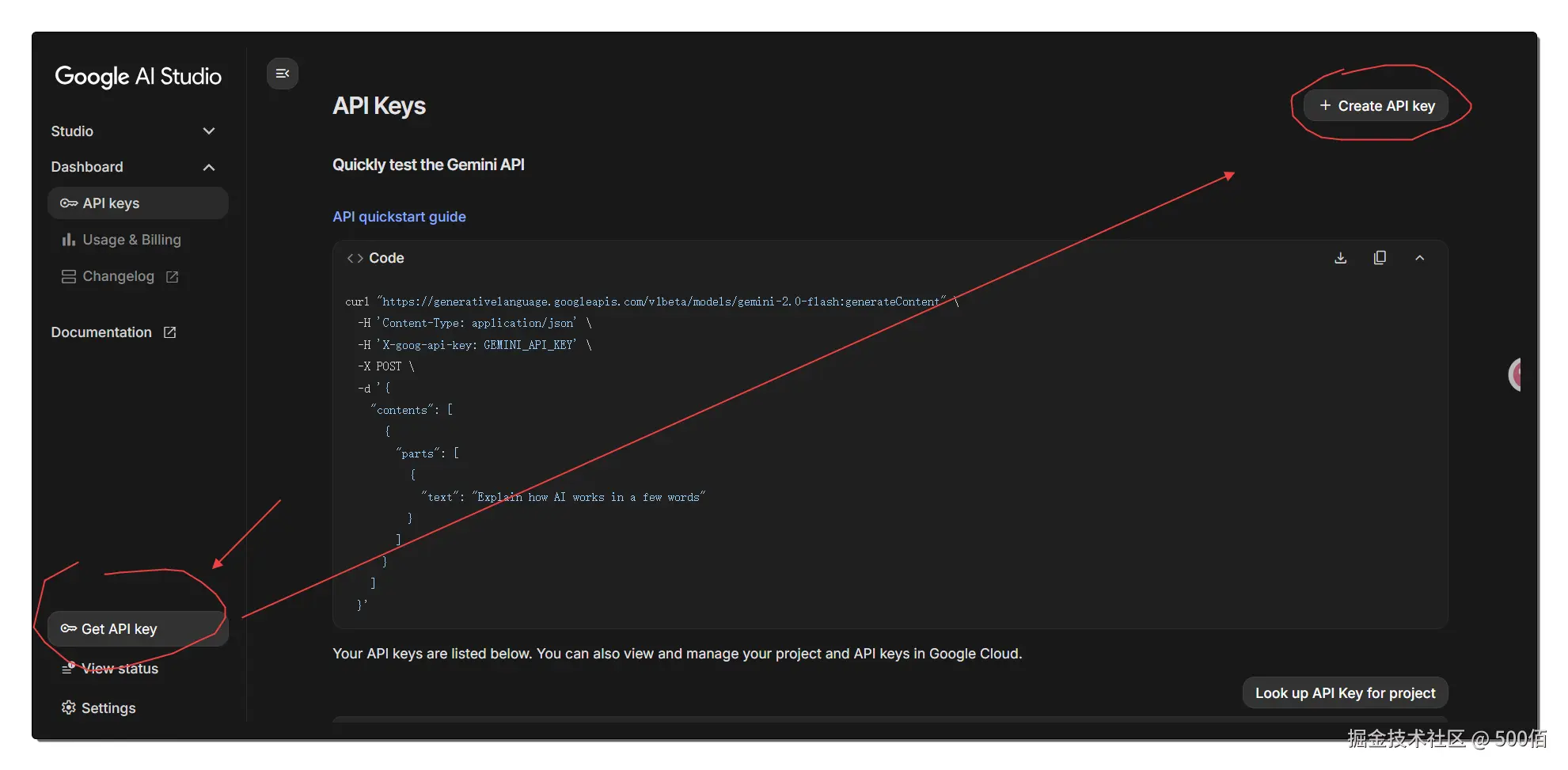 实操:先进入Google AI Studio首页,点击Get API key,然后再点击Ceate API key ,就可以使用了。