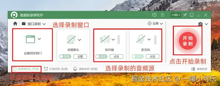 步骤2:在 “窗口录制” 模式下,锁定需要录制的窗口,设置好需要录制的音频源。如果你需要固定的录制时长,还能开启 “按时长录制” 功能,提前设置好结束时间,软件会在达到设定时长后自动停止录制。完成上述参数调整后,点击界面右侧的 “开始录制” 按钮,软件便会按照你的设置开始录制操作了。