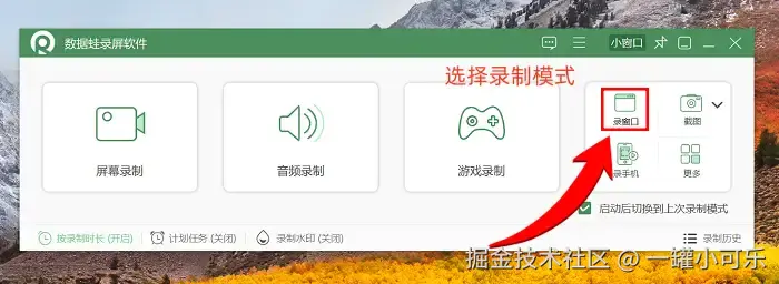 步骤1:首先在电脑端找到数据 蛙录屏软件,双击图标将其打开。该软件界面设计简洁,无任何广告弹窗干扰,能让你快速聚焦核心操作。进入主界面后,无需多余步骤,可以直接从提供的多种录制模式中进行选择,本次重点介绍 “窗口录制” 模式的操作流程。