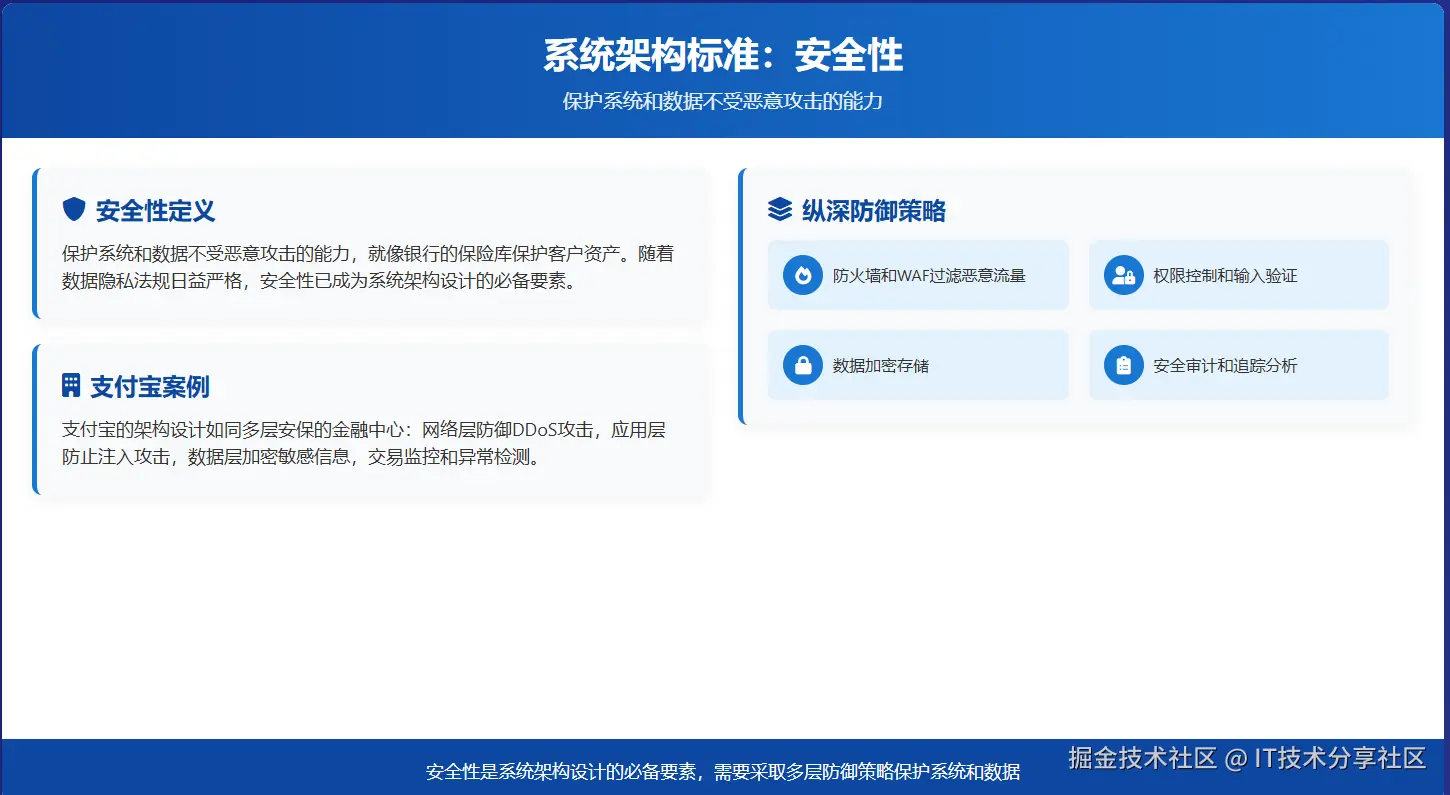 安全性是保护系统和数据不受恶意攻击的能力,就像银行的保险库保护客户资产。随着数据隐私法规日益严格,安全性已成为系统架构设计的必备要素。