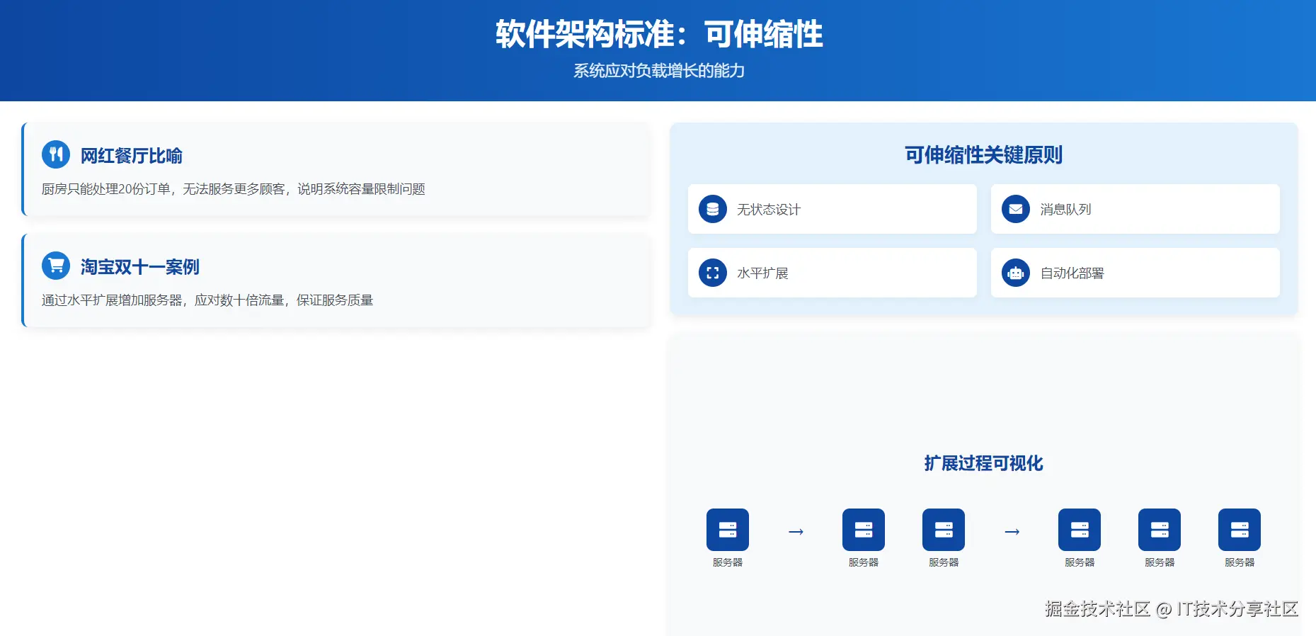 设想一家突然爆红的网红餐厅。如果厨房只能同时处理20份订单,即使门口排起数百人长队,也无法服务更多顾客。可伸缩性衡量的是系统通过增加资源应对负载增长的能力。