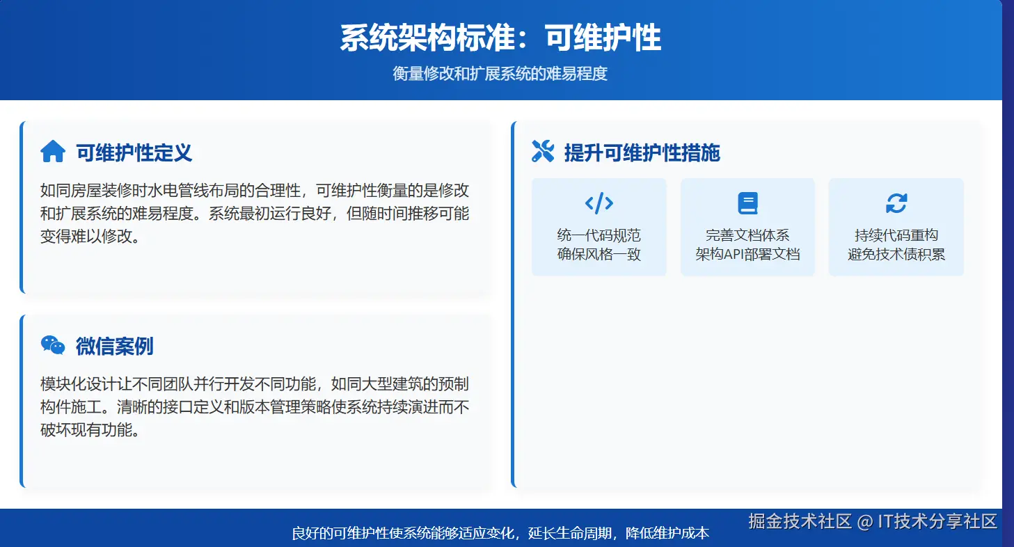 可维护性衡量的是修改和扩展系统的难易程度,就像房屋装修时水电管线布局的合理性。许多业务系统刚开始运行良好,但随着版本的不断迭代,最后变得越来越难以修改和维护。