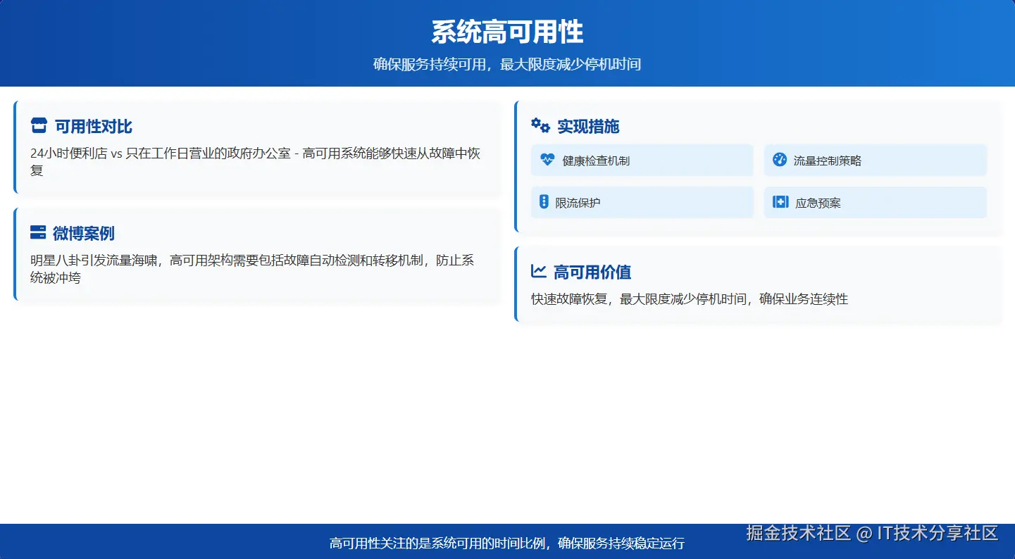 可用性关注的是系统可用的时间比例,就像一家24小时便利店与只在工作日营业的政府办公室的区别。高可用系统能够快速从故障中恢复,最大限度减少停机时间。