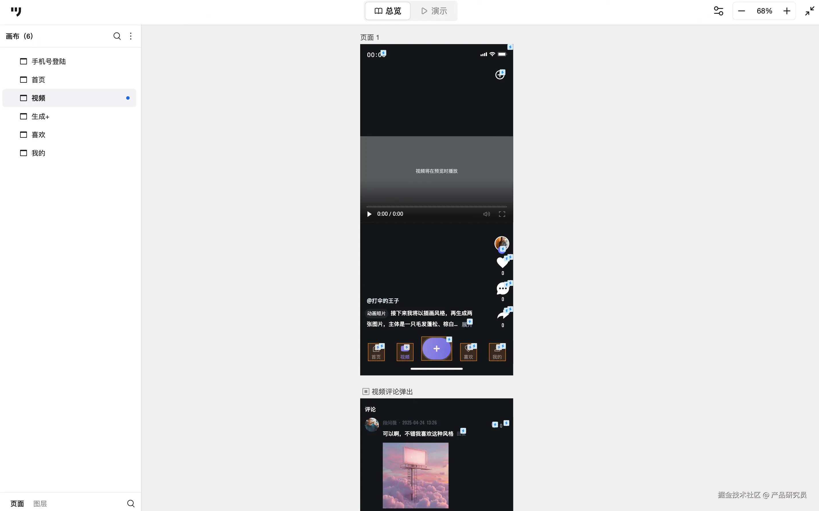 以素材广场中的 “AI内容创作”APP原型为例,该应用整体框架由五大核心模块组成:首页、视频、生成+、喜欢、我的。