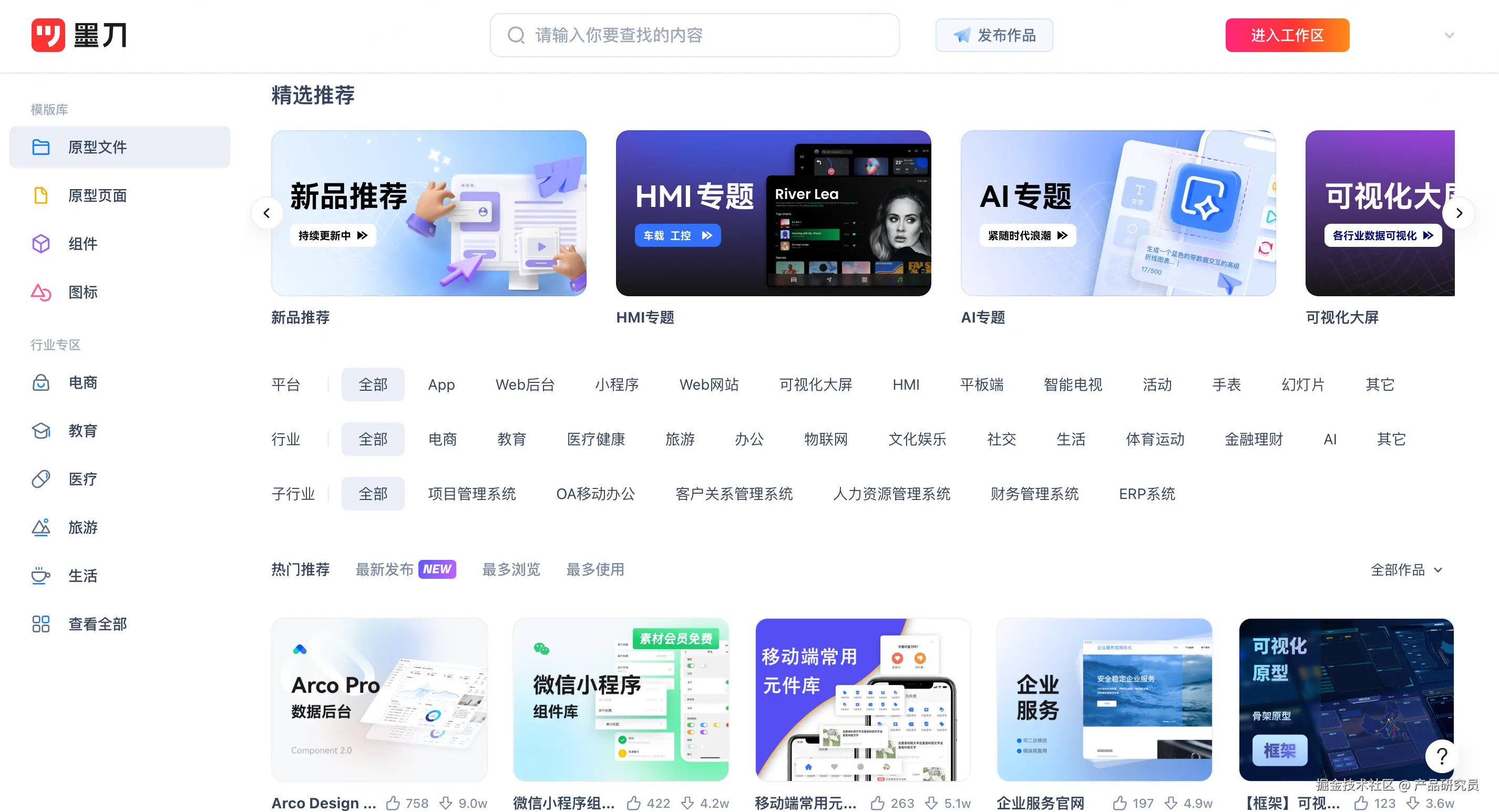 素材广场。产品经理可以通过借鉴原型素材模版(如墨刀的素材广场、Figma资源社区),直接复用成熟的页面结构与交互逻辑,减少从零开始绘制的重复劳动。同时,模版往往自带行业场景最佳实践,能够帮助团队快速对齐设计思路。