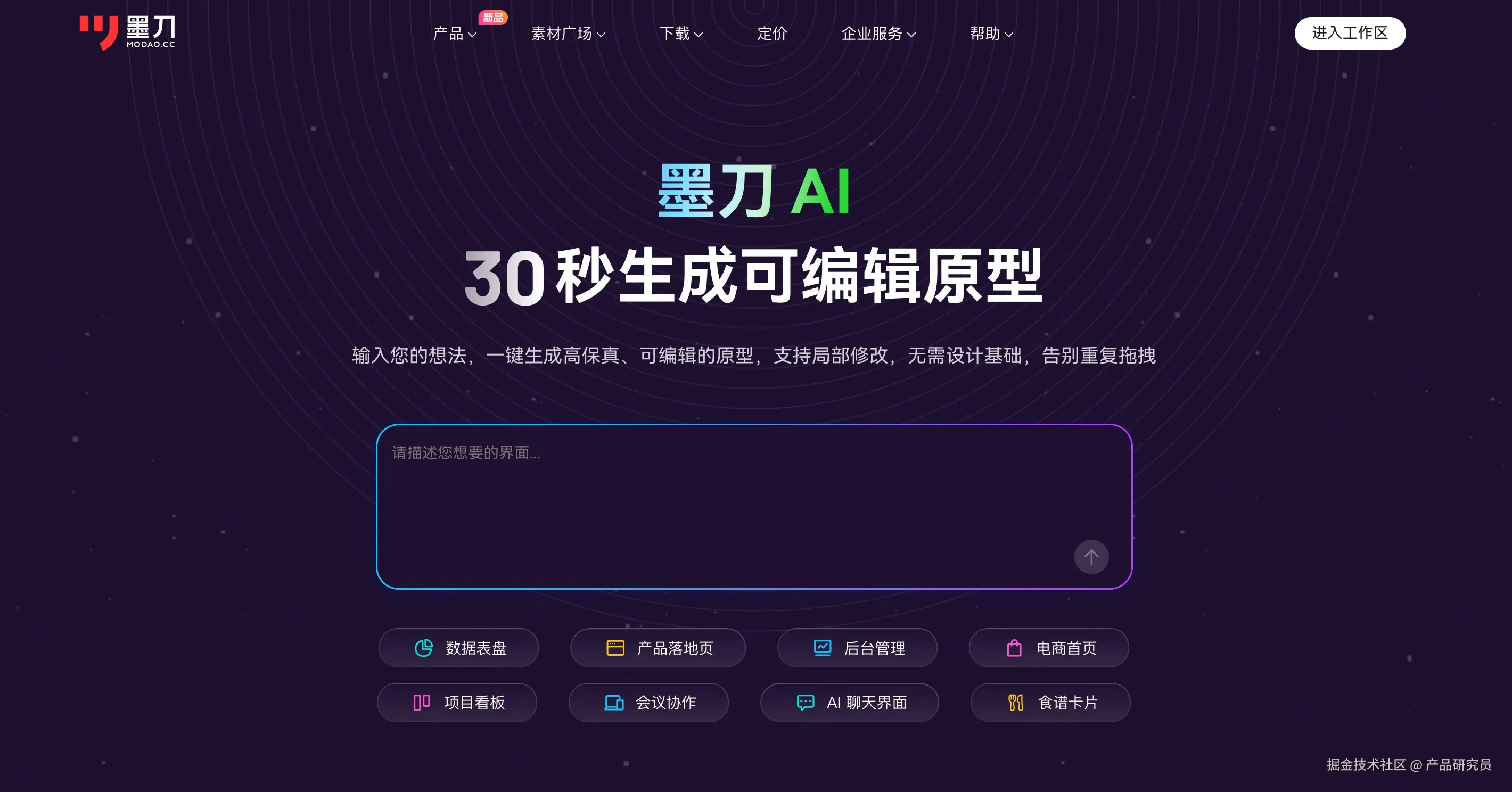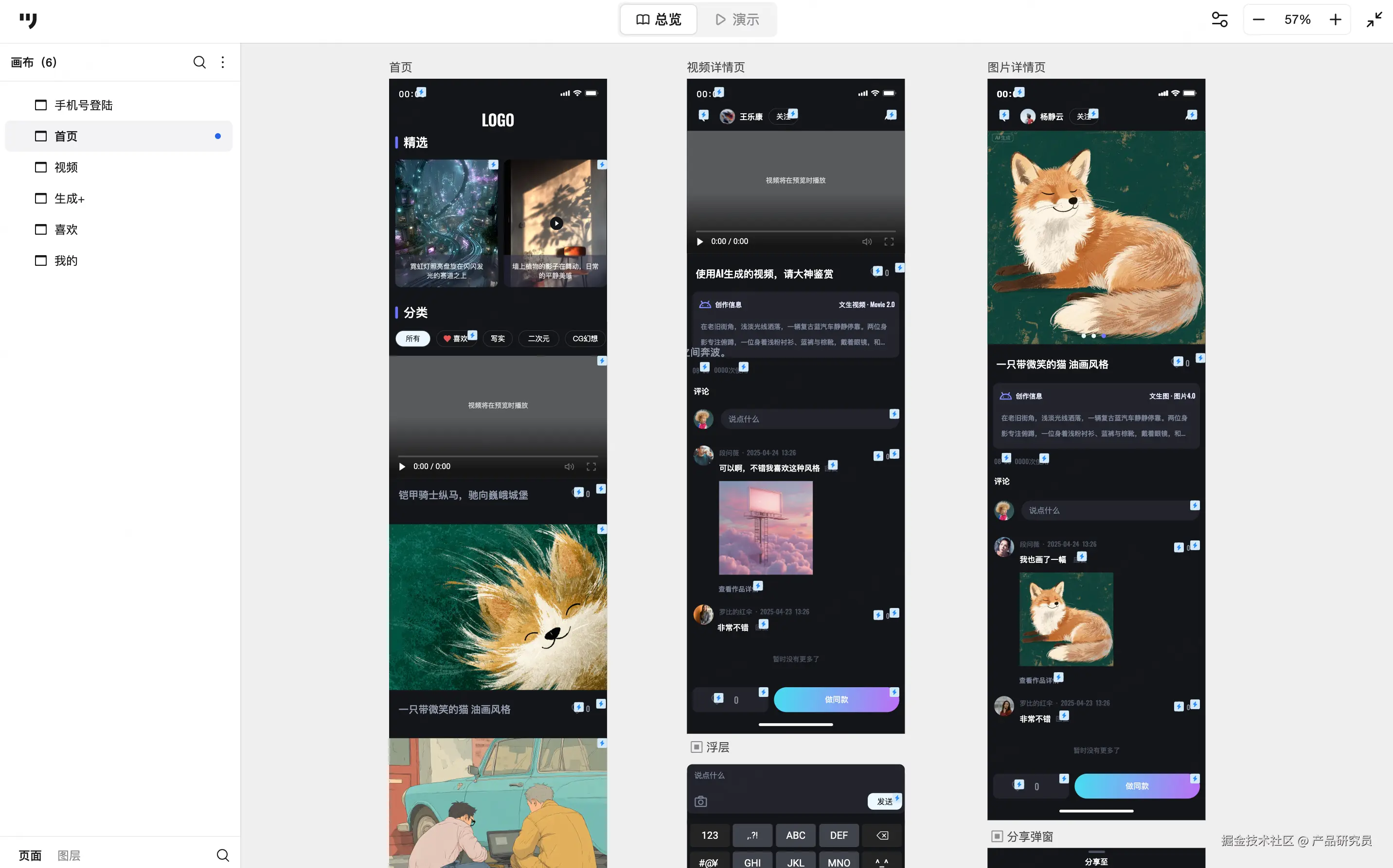 借助智能化技术的支持,许多“内容创作类APP”在原型设计阶段就开始探索新的交互与功能布局,使得产品既能承载复杂的生成逻辑,又能保持操作的直观与流畅。下面以墨刀素材广场中的 “AI内容创作”APP原型为例,对其框架与设计思路进行拆解,并归纳出此类产品的通用要点,供有类似需求的产品经理参考。