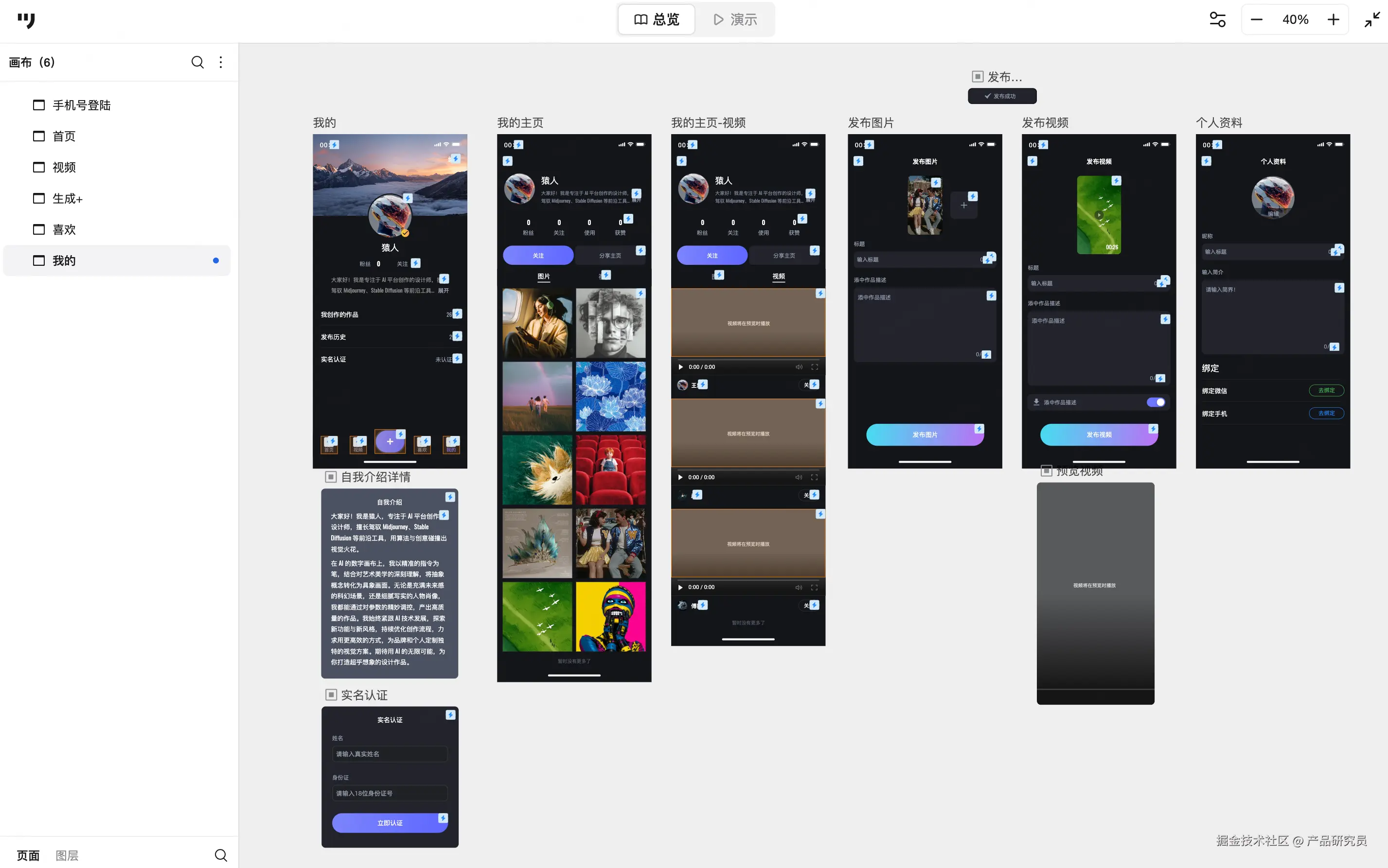 - 我的模块:居中展示用户头像(支持背景图设置),下方展示粉丝与关注数据,并提供“我生成的作品”“发布历史”“实名认证”等入口,方便用户管理个人资产和身份信息。