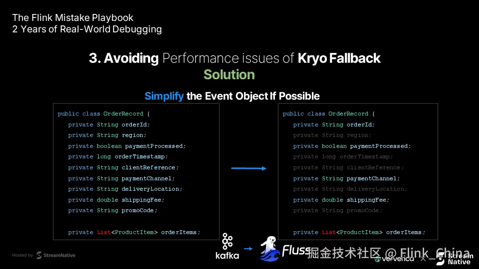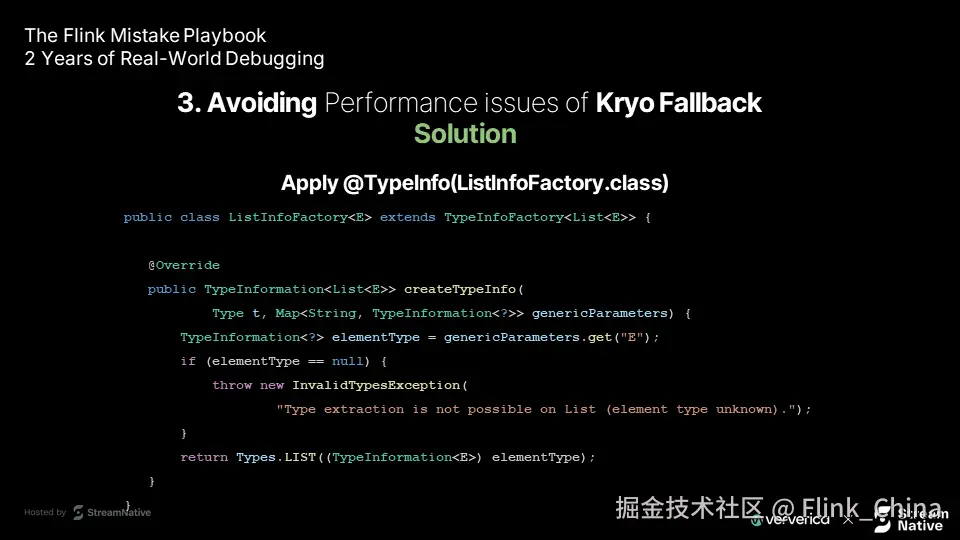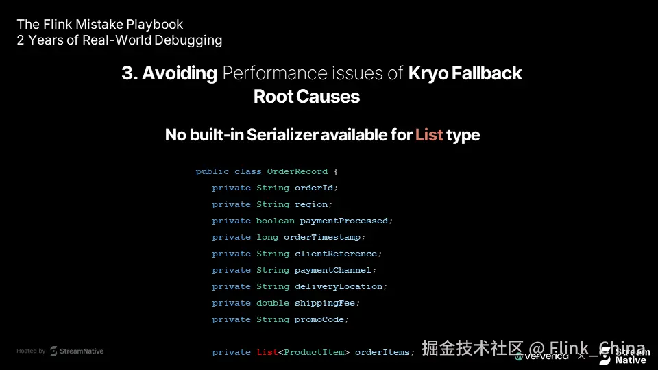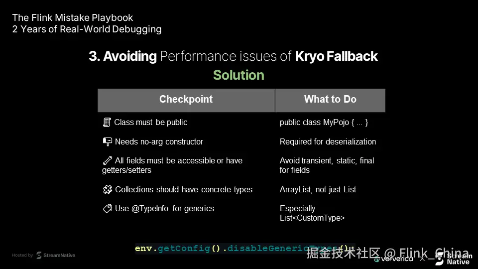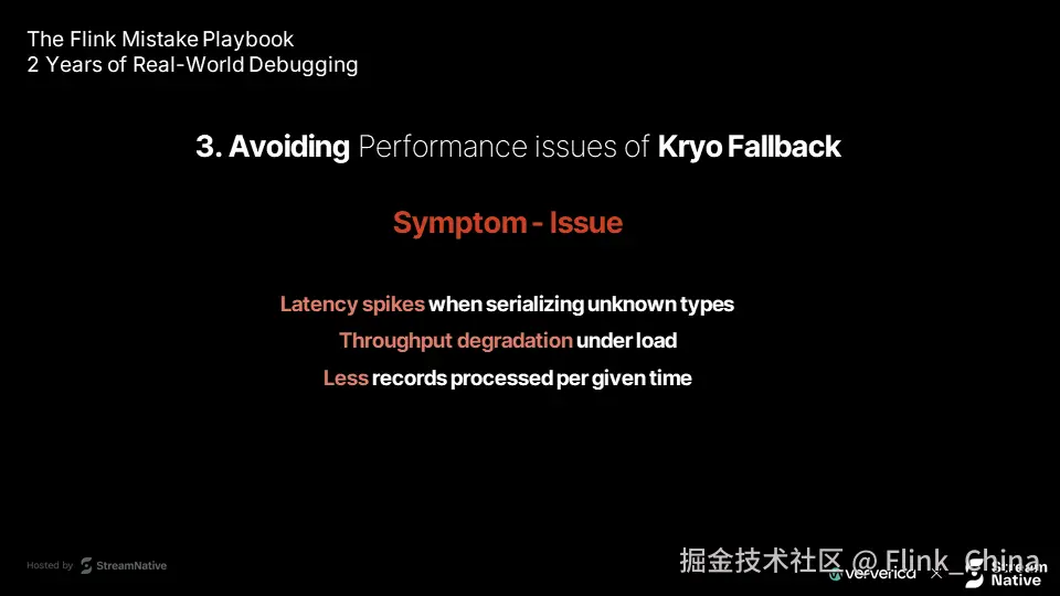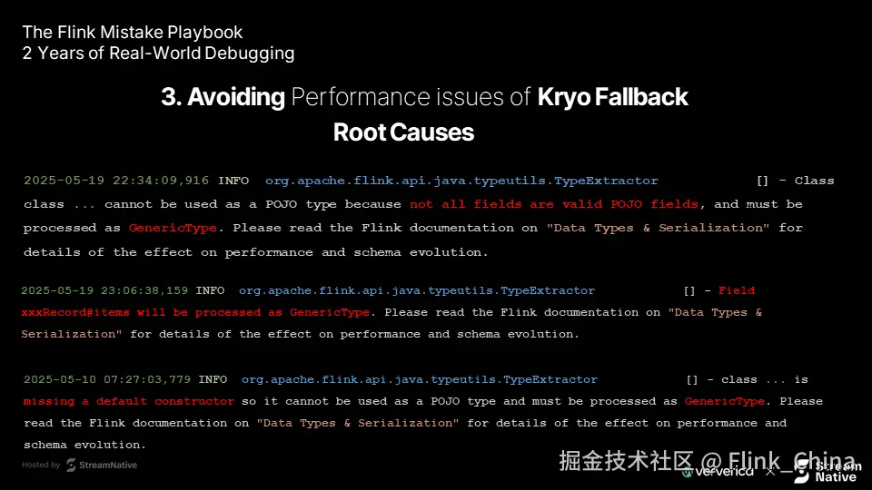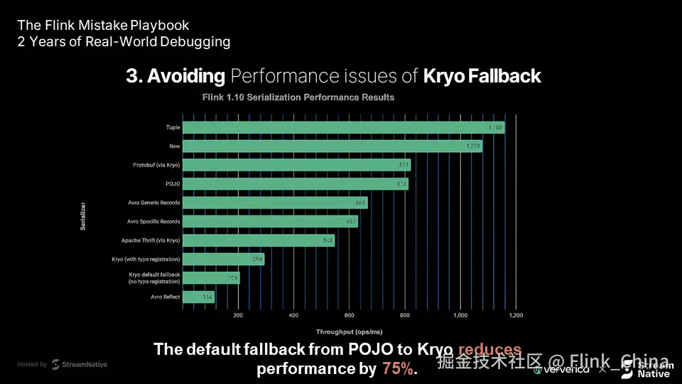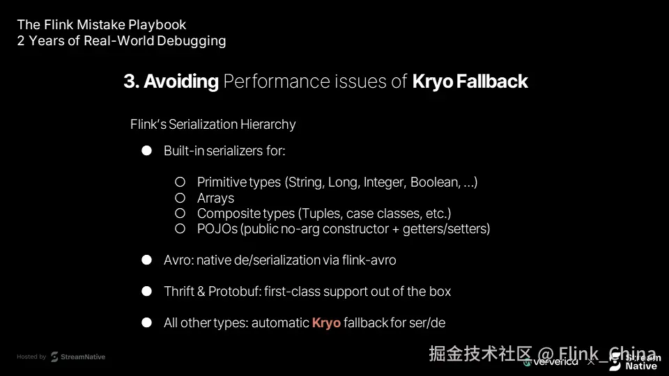 当无法使用前五类时,Flink 自动回退至 Kryo,可能引发严重性能问题。