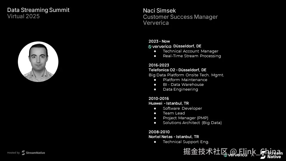 职业背景涵盖多个技术领域:自 2023 年起专注于实时流处理技术支持;2016–2023 年在 Telefonica O2 负责大数据平台的现场技术管理,积累了平台运维与 BI 数据仓库建设经验;2010–2016 年于华为担任软件开发工程师、团队负责人、项目经理(PMP)及大数据解决方案架构师;早期在 Nortel Netas 担任技术支持工程师。十余年的分布式系统与大数据实践经验,为深入理解流处理系统的复杂性提供了坚实基础。