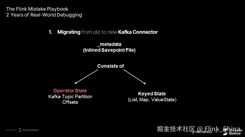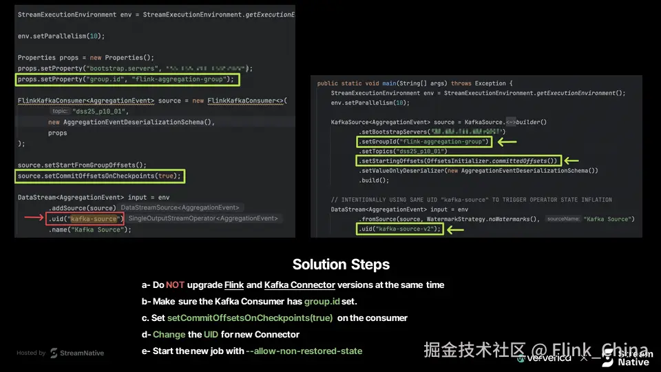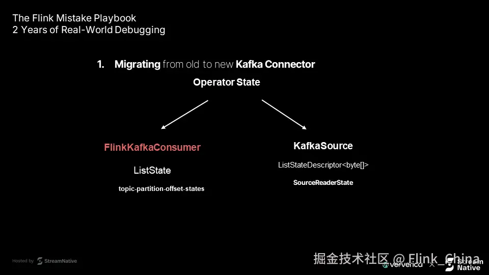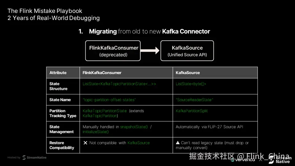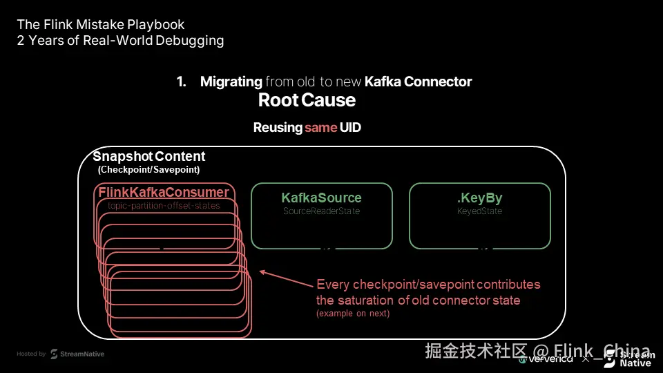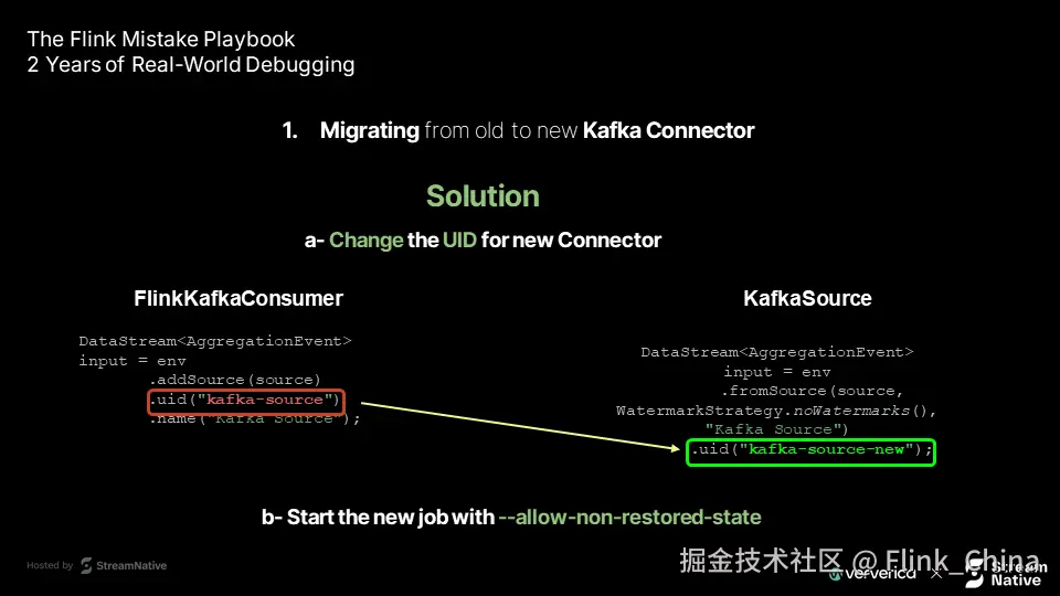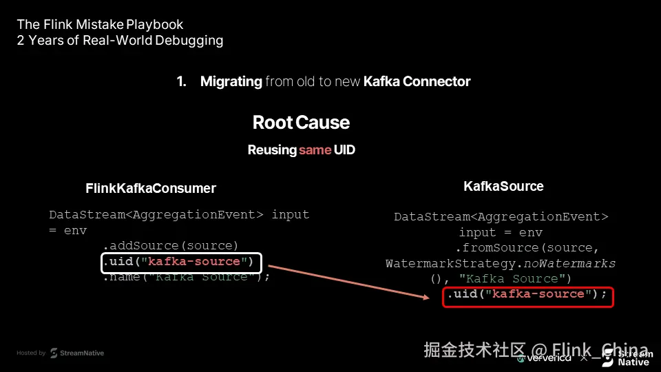 典型误操作是:认为“只是更换 API,功能未变”,于是保留原有 UID。但 Flink 依赖 UID 关联算子与状态。当 UID 相同,系统会错误地将旧状态尝试恢复到新算子。