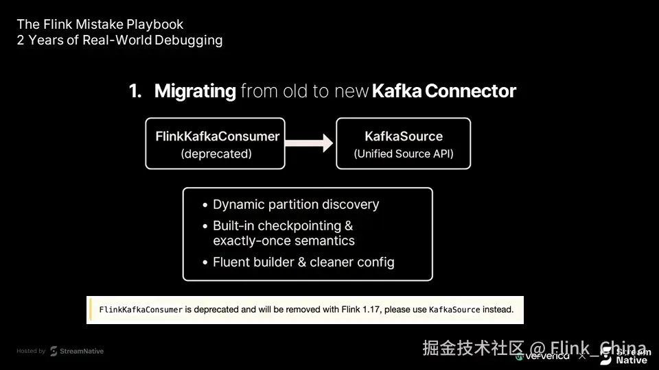 许多用户正在或将要将 Flink 作业从旧版 Kafka 连接器(如 FlinkKafkaConsumer)迁移到新版 KafkaSource API。这不是一个可选项,而是 Apache Flink 生态持续演进的必然趋势。