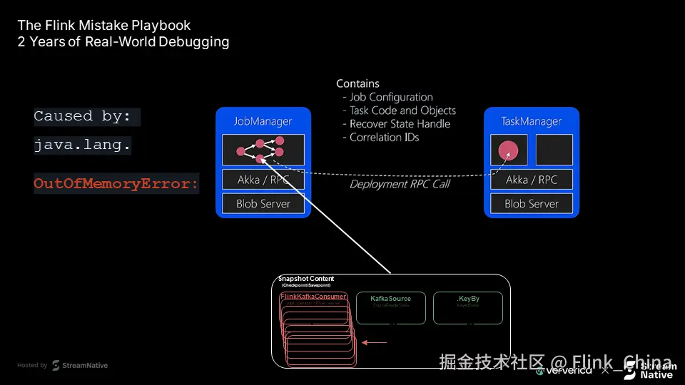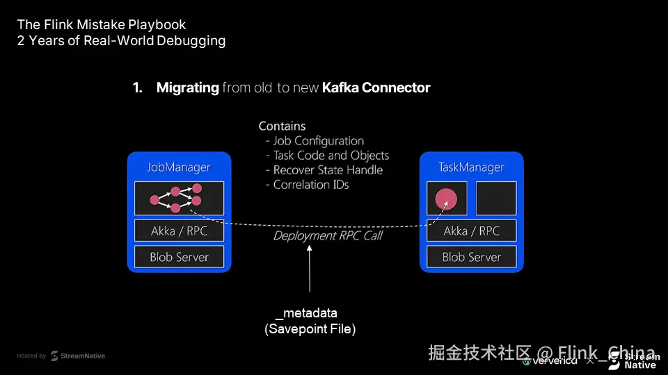 JobManager 在恢复作业时,会通过 RPC 将 _metadata 中的状态分发给各 TaskManager。一旦该文件过大,就可能触发 RPC 消息超限或内存溢出。