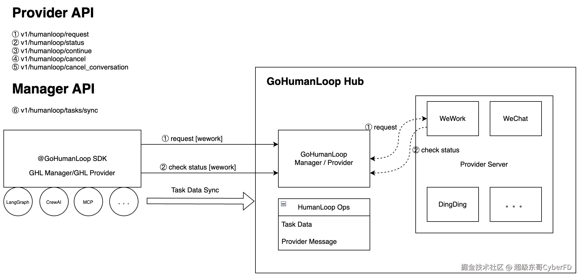 GoHumanLoopSDK适配各大AI Agent框架形成简单易用的使用方式,支持三种方式审批请求、信息获取和对话交流,去进行人机协同的处理GoHumanLoop内部提供 HumanLoop 任务管理器和请求处理提供者(Provider),通过 API 方式与 GoHumanLoopHub 进行交互GoHumanLoopHub还能与飞书、企业微信等进行集成,实现与飞书、企业微信等应用的无缝对接。需要依赖一层转换层,目前已提供对应的服务程序例子gohumanloop-feishu和gohumanloop-wework 后续还会继续拓展其它 OA 平台,让人机协同更好的集成到业务当中- 管理人员通过