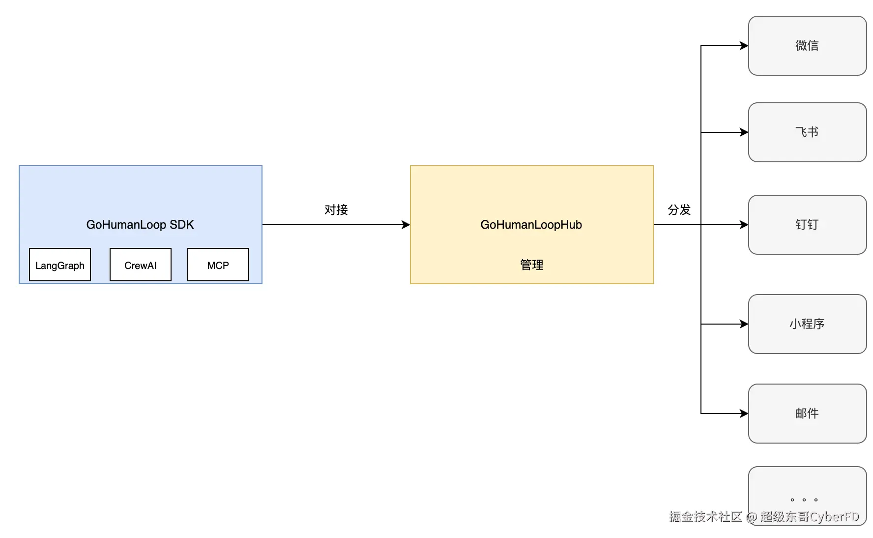 GoHumanLoop的定位: 我认为它是一个AI的基础设施,是长在各大Agent框架(LangGraph、CrewAI)中的一个中间层,它充当了这些 AI 框架和人交互的协同桥梁 -