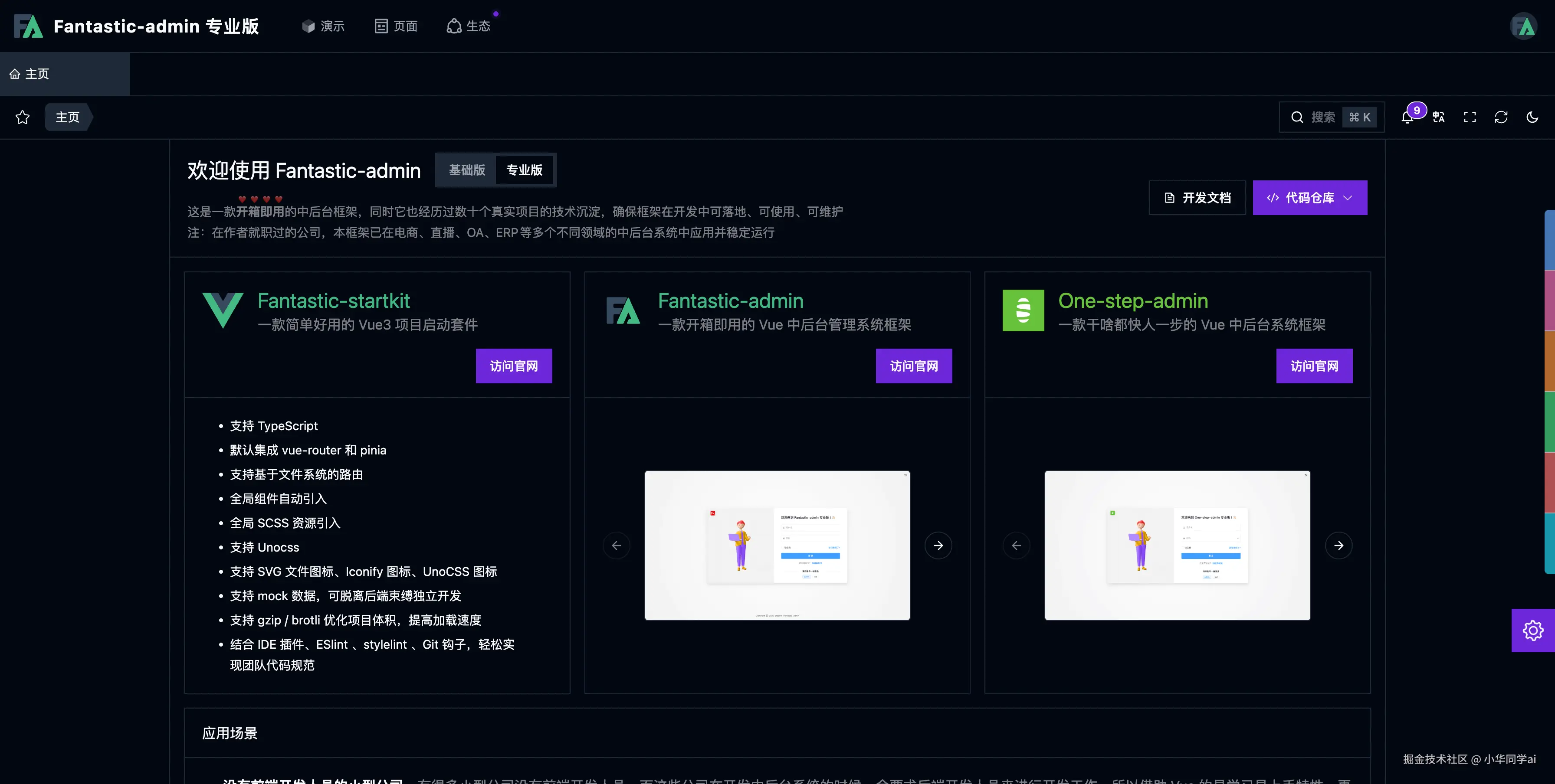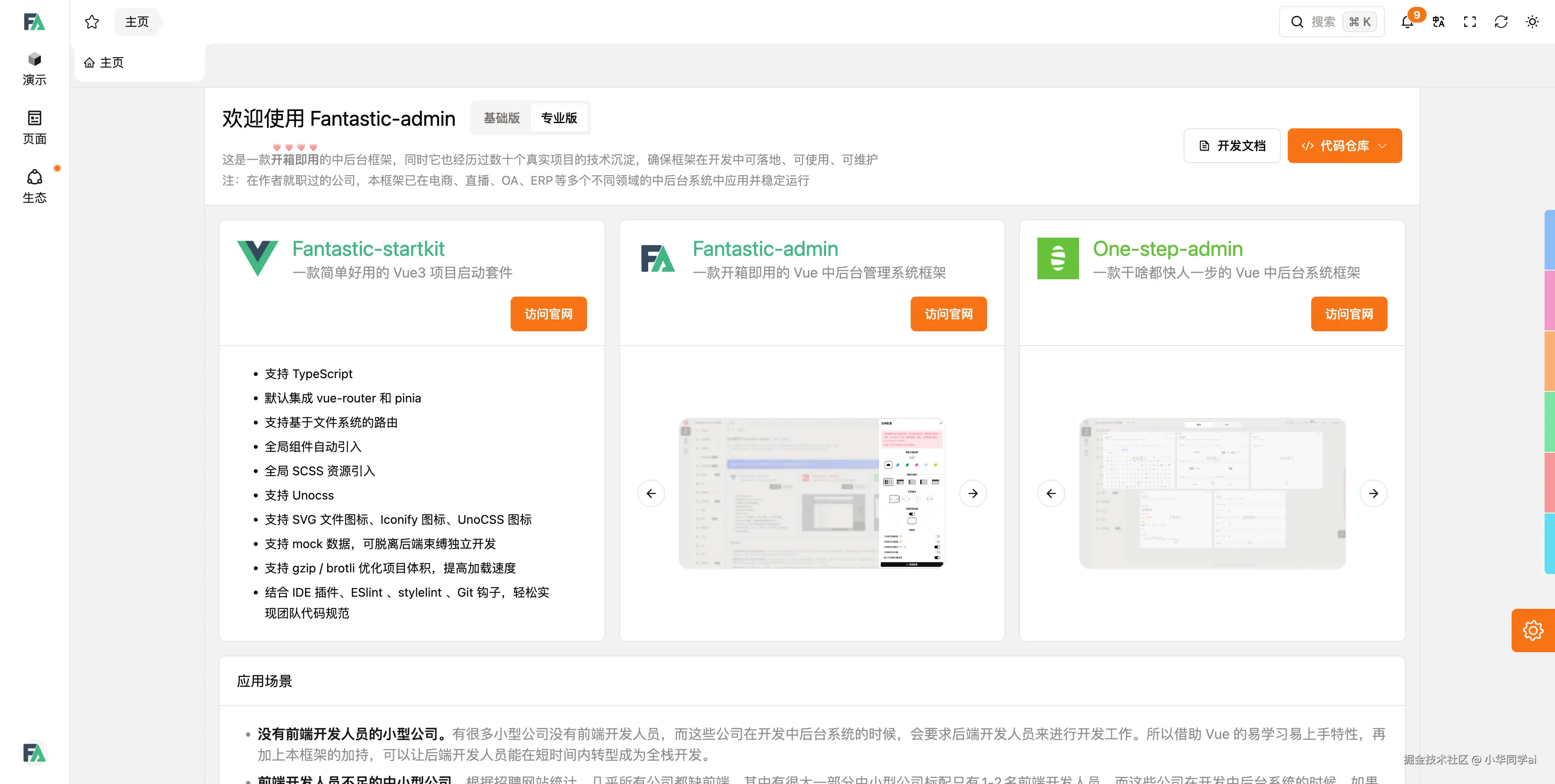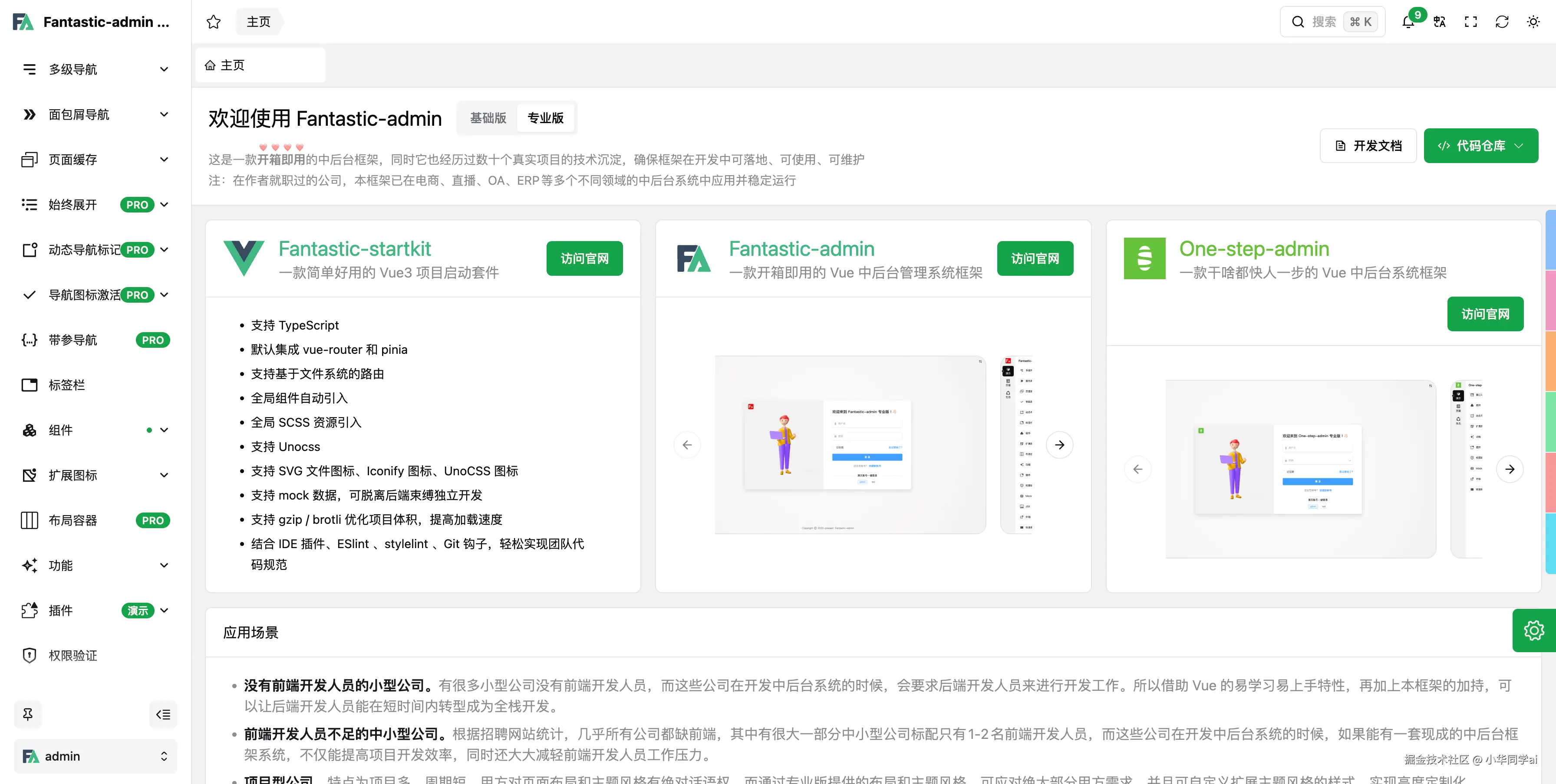 Fantastic‑admin/basic 是一个成熟、开箱即用、自由度高的 Vue3 后台框架,拥有丰富 UI 换装能力、标签页缓存机制、权限体系和国际化支持,非常适合对交付速度、结构清晰度和终端兼容要求高的项目。现有约 3k star,生态配套完善,是中小团队和个人开发者效率提升的好帮手。