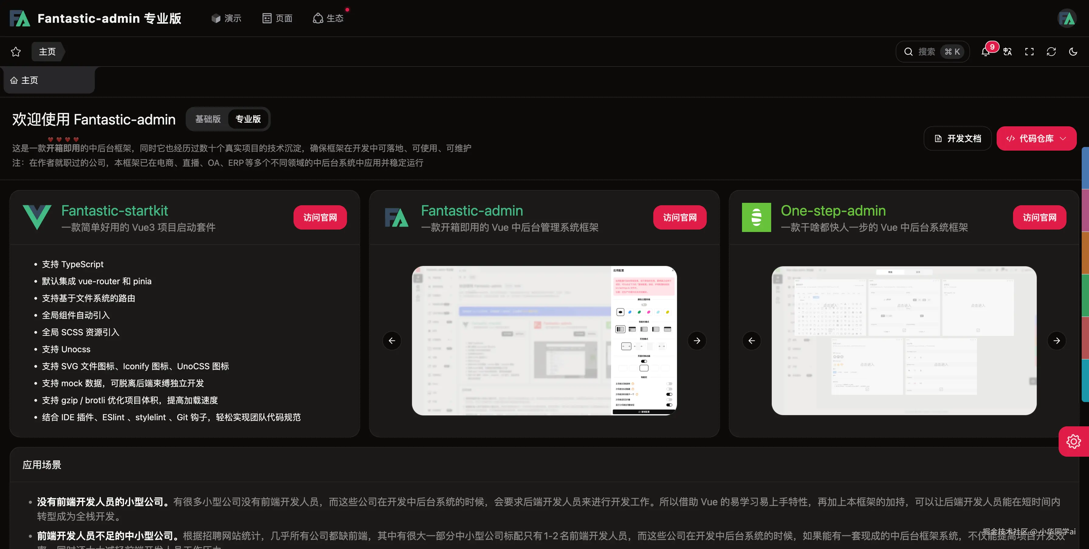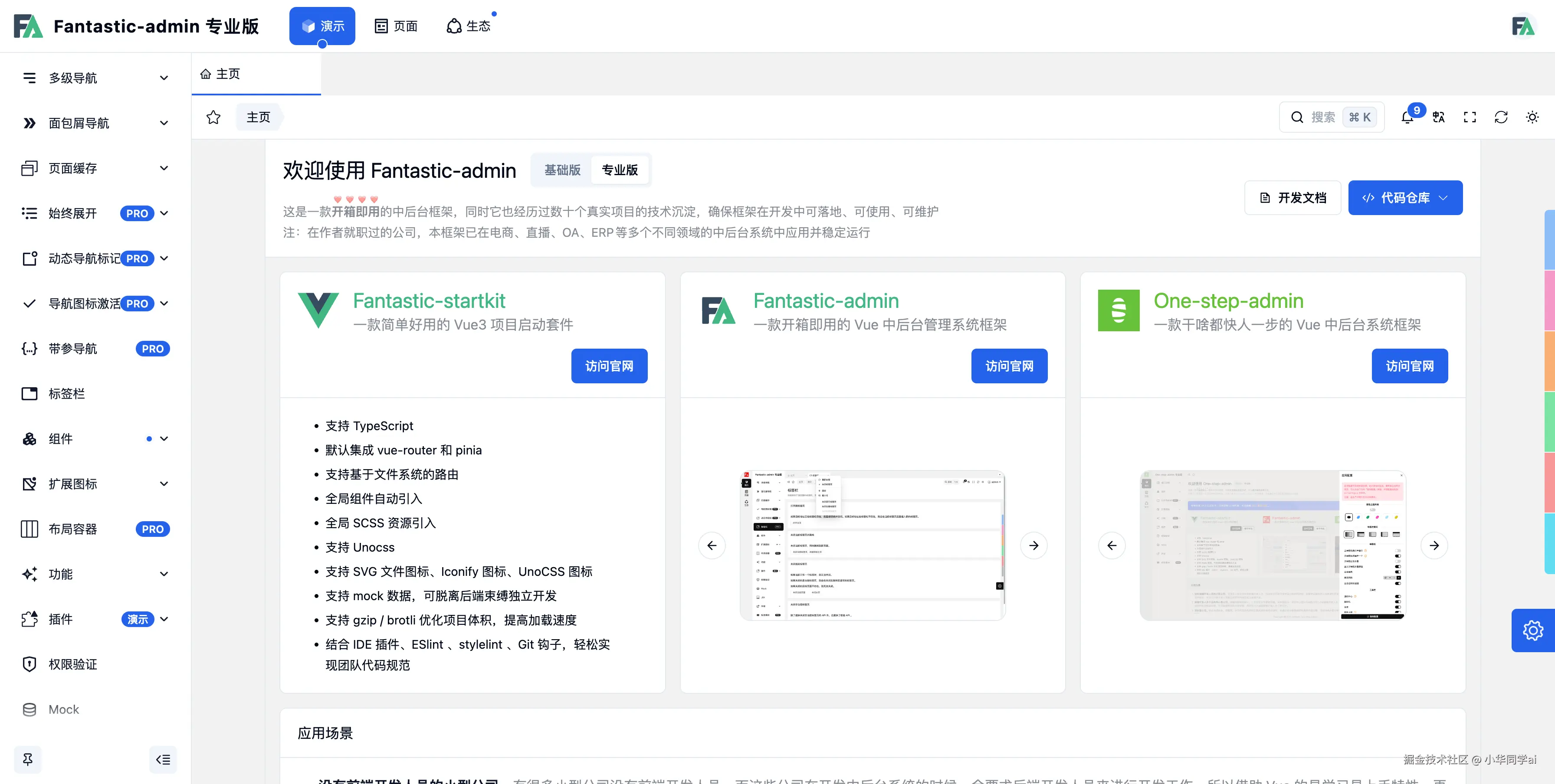 | 可定制性强 | UI 库、主题、布局、权限模块随意组合 |