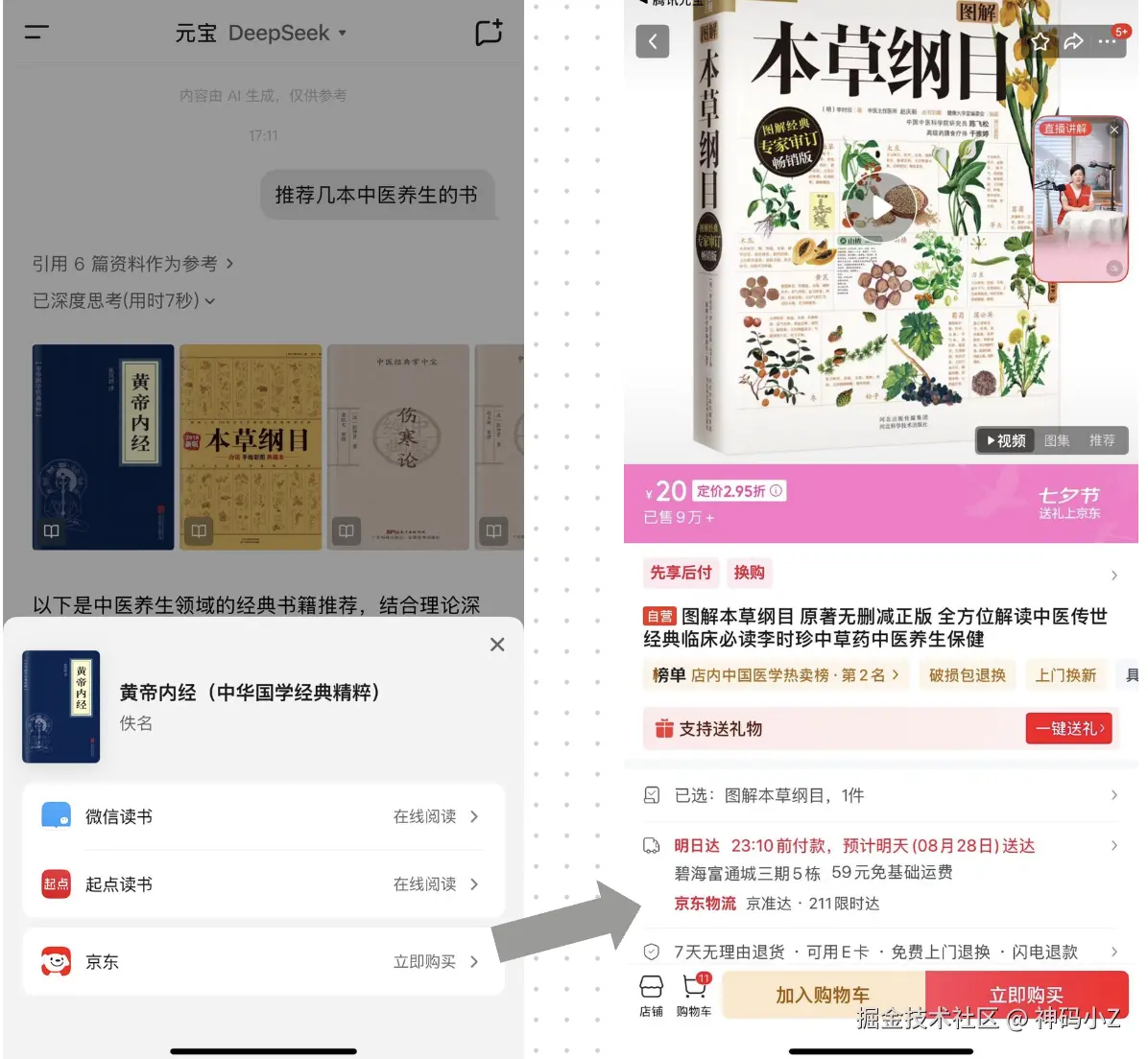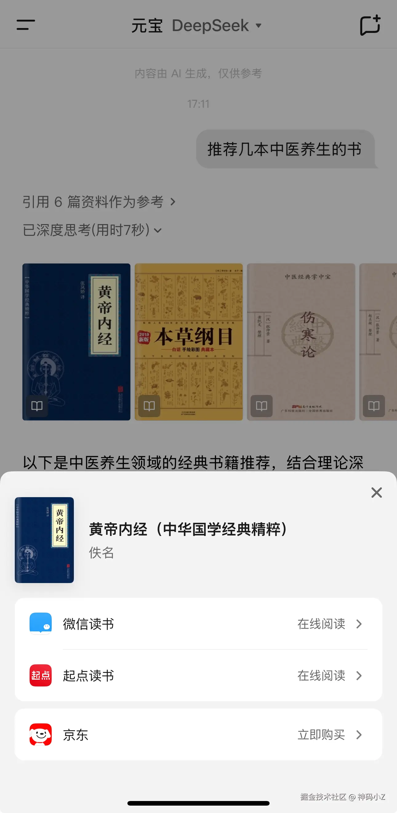 在元宝里搜到一本书,除了能跳到微信读书看电子版,现在还可以一键跳京东下单纸质书。想收藏还是想先读,自己选。