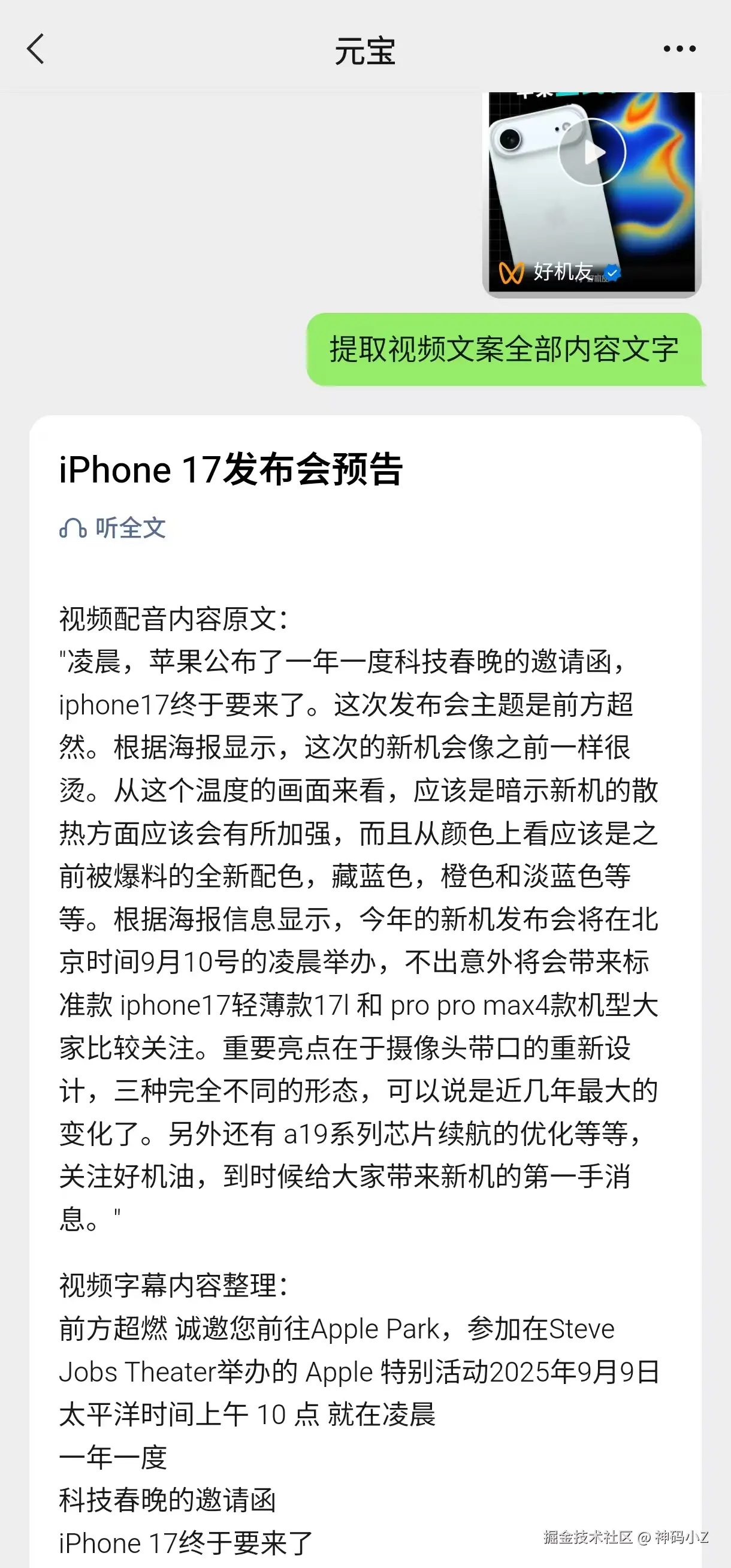 看到一条干货视频,想把逐字稿存下来。把视频转发给微信里的“元宝”,发一句“提取视频文案全部内容”