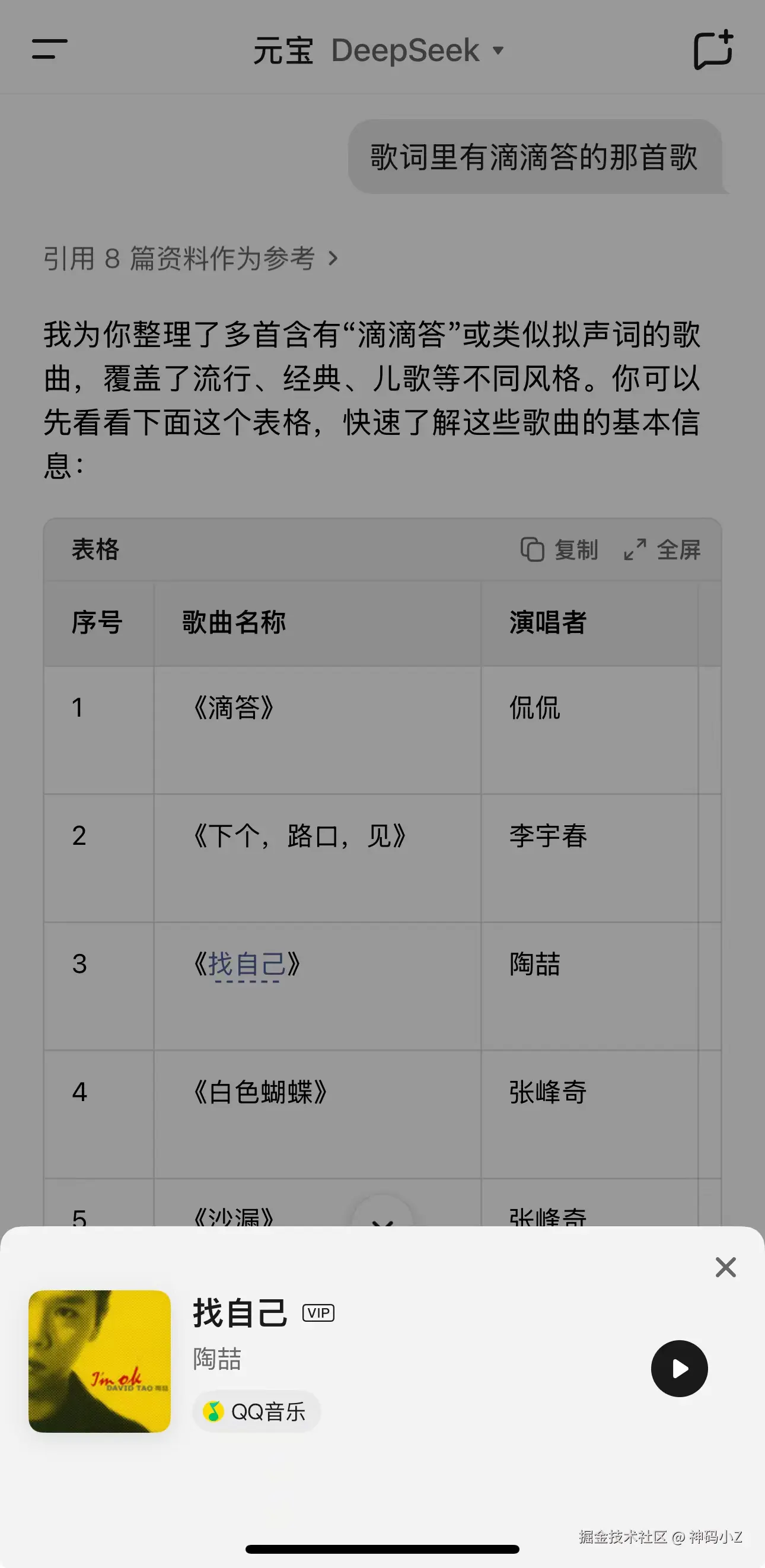 有时候脑子里就卡着一段旋律,比如“滴滴答”,名字完全想不起来。对元宝说:“歌词里有滴滴答的那首歌”,它能把相关歌曲列一串。点歌名就能直接听(提前给 QQ 音乐授权就行)。
