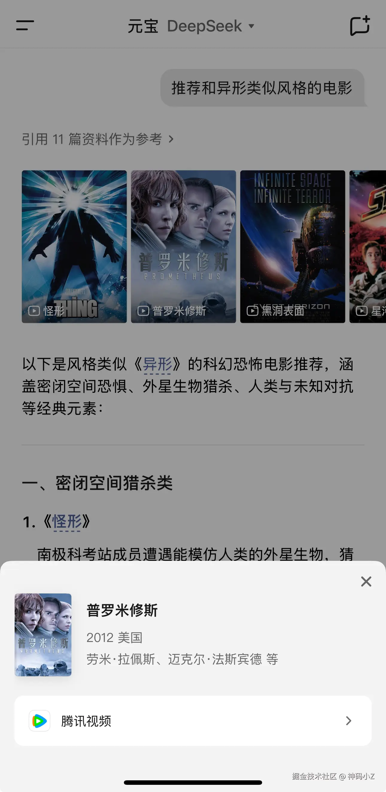 只记得片段或台词,比如“马冬梅”,也能让元宝帮推荐相似风格作品。搜到后点封面或标注的部分,直接跳到腾讯视频播放。