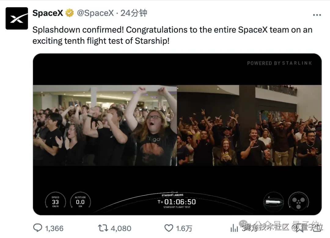 SpaceX 官推也迅速发布了试验成功的消息,画面中现场和后台工作人员一片欢腾。
