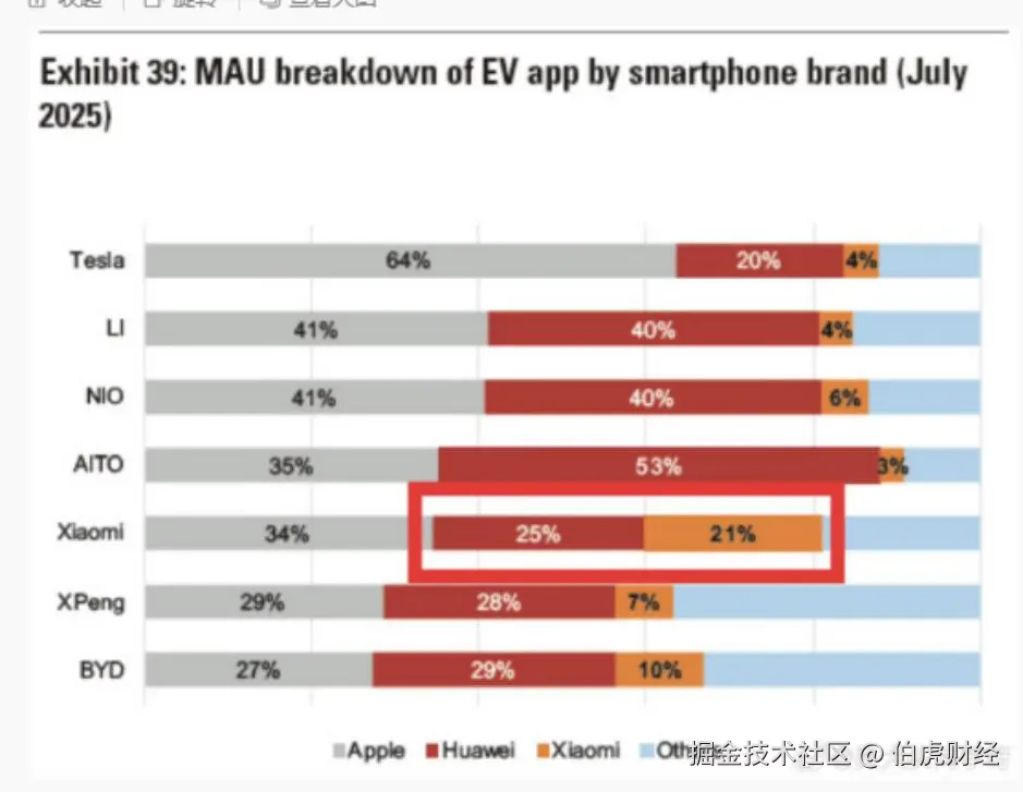 其次,小米汽车带来的高端影响力仍在强化。二季度,小米汽车平均售价已超过25万元(含税价超过28万元),接近宝马、奔驰、奥迪在中国的30万元均价。而根据外媒此前披露的一份数据,小米汽车的用户中,使用小米手机的比例只有21%,使用华为手机和苹果手机的比例分别为25%和34%。