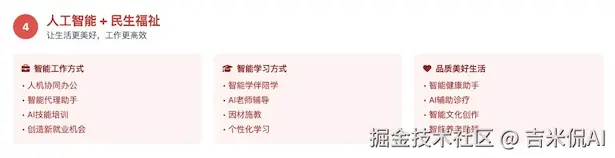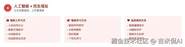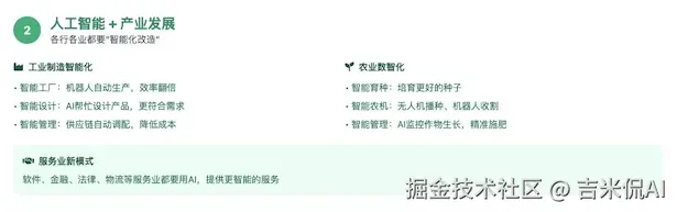 产业发展领域:所有传统行业都要重做一遍。你想象一下,当工厂车间里的每一台设备都能自动学习优化,当农田里的每一寸土地都有AI精准管理,会创造多少新的工作机会?