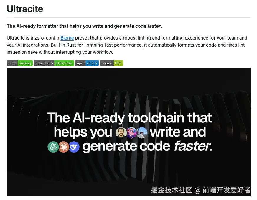 Ultracite = 基于 Rust 的 Biome 零配置预设,把 Prettier + ESLint + 一堆插件打包成一个「即装即用」的 AI 友好工具链。