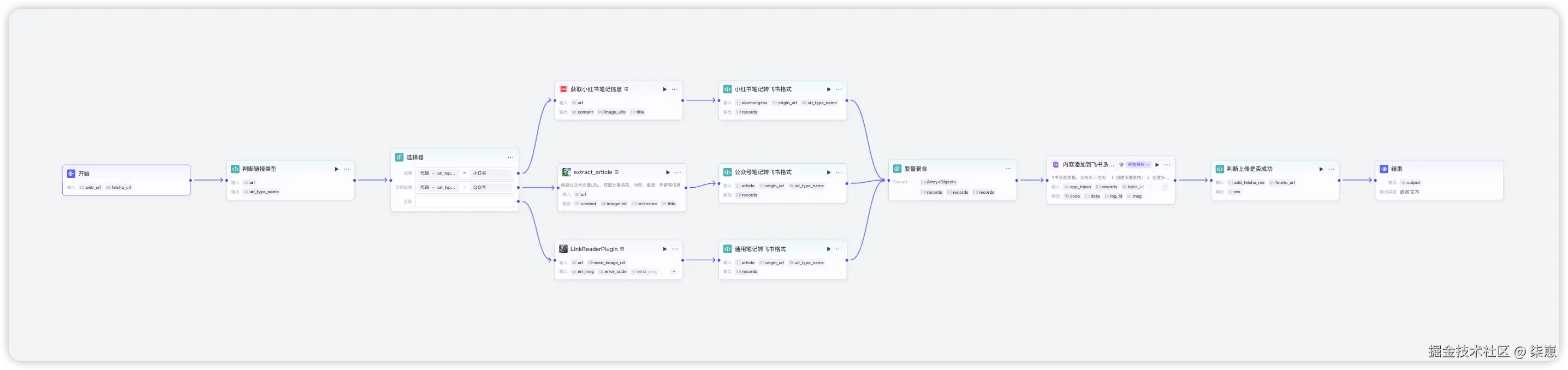 开始节点→判断链接类型→选择器节点→文章采集→笔记格式化→变量聚合→记录保存到多维表格→判断是否上传成功→结束节点。