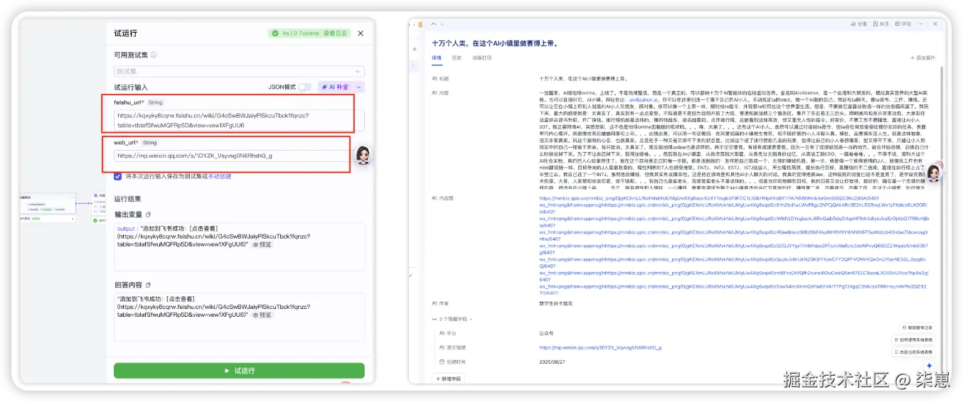 在工作流中输入:飞书文档链接 + 网站地址。