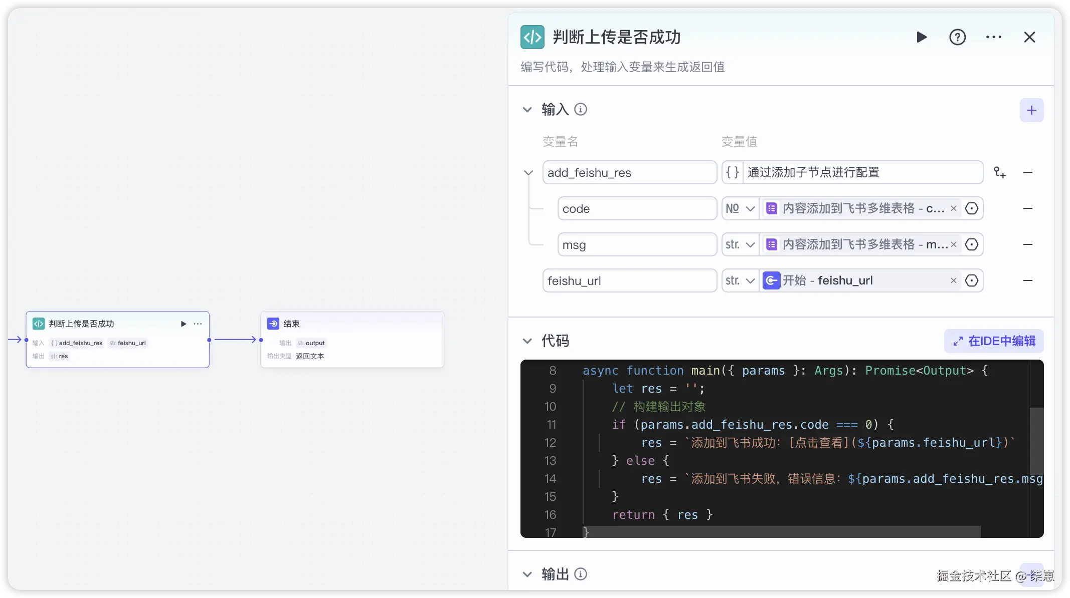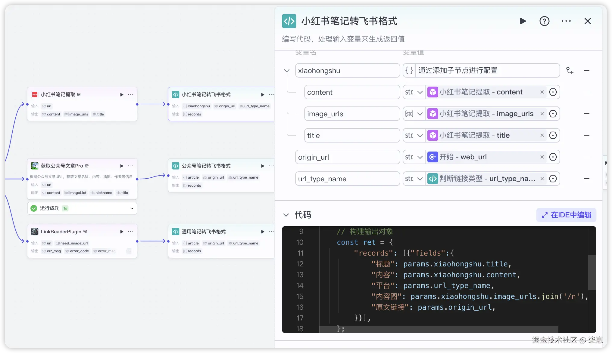 这个节点用代码才方便处理,三个流程都大同小异,就是将采集的内容,转成飞书多维表格的字段。