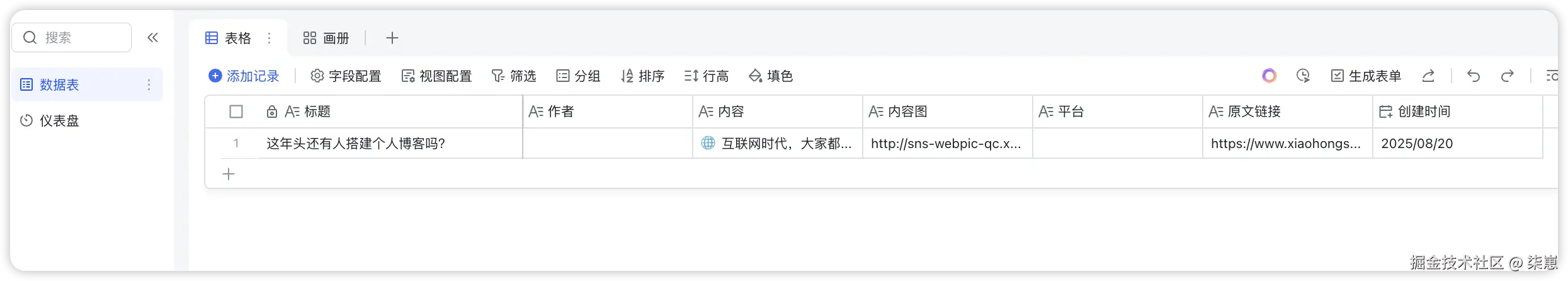 飞书多维表格用来储存coze工作流采集的文章内容。需要先创建表格,后续 Coze 工作流会将采集到的内容自动填入对应字段。