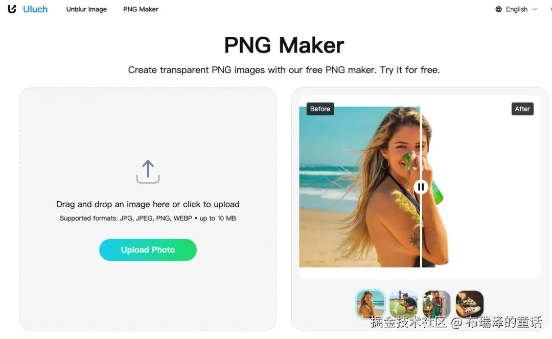 Uluch 是一个无门槛的在线 AI 图像工具集合,目前有去模糊修复与生成透明 PNG(去背景) 。界面简洁、操作直观:无需注册、无水印、每 24 小时可免费使用 5–10 次。对个人和小型电商团队都非常友好,可以快速产出可用素材用于原型、Demo 或生产图。
