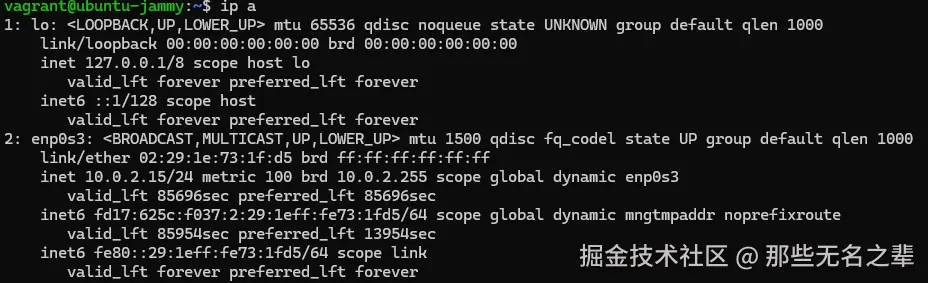 enp0s3 是物理网卡接口(常见于虚拟机或物理机,命名规则:en=Ethernet 以太网,p0=PCI 总线 0,s3= 插槽 3),用于连接外部网络(如路由器、交换机),是本机与其他设备通信的核心接口。