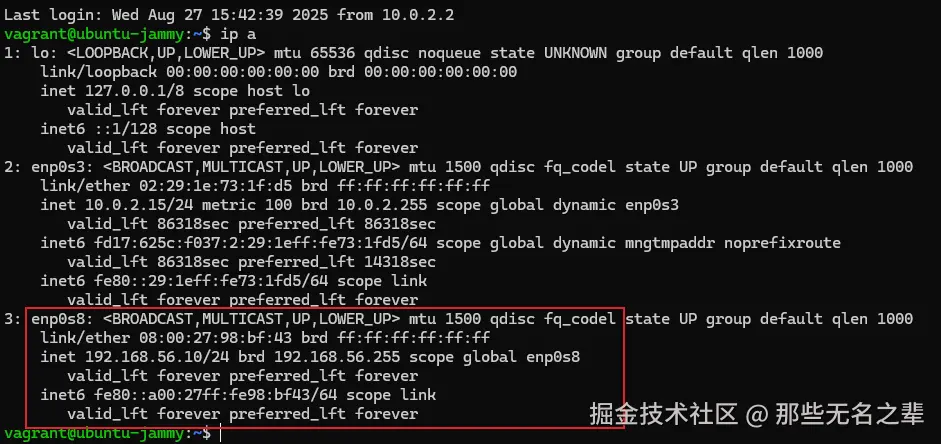 📌 这里的 192.168.56.10是你为虚拟机手动指定的一个私有局域网 IP,一般选用 192.168.56.x这个网段(VirtualBox 默认支持的私有网络段)。