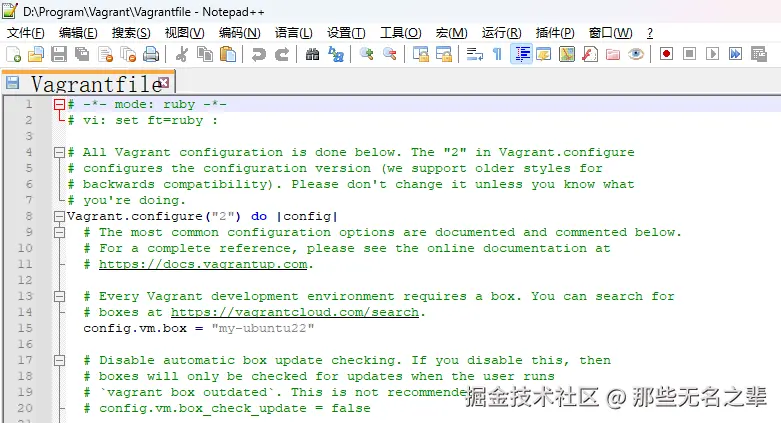 my-ubuntu22:是你给这个 box 起的本地名称(自定义,可随便取,比如 ubuntu22-local、jammy-box等),之后在 Vagrantfile 里会用到它;