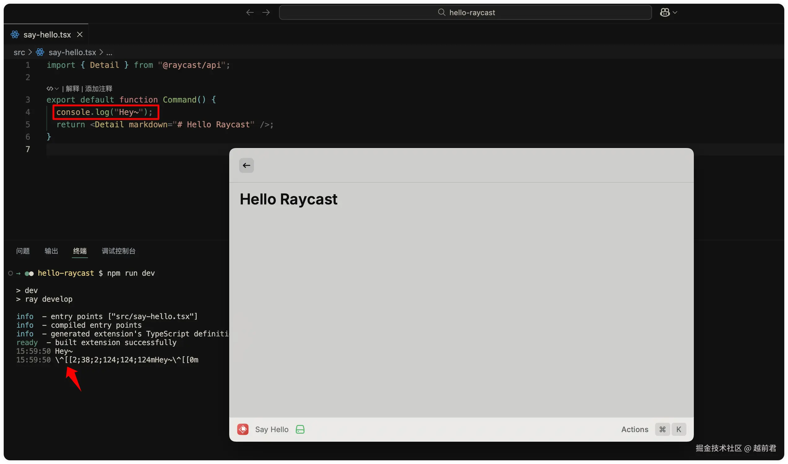 当我们执行 npm run dev(即 ray develop)时,它会自动安装扩展,并以开发模式启动 Raycast 应用。