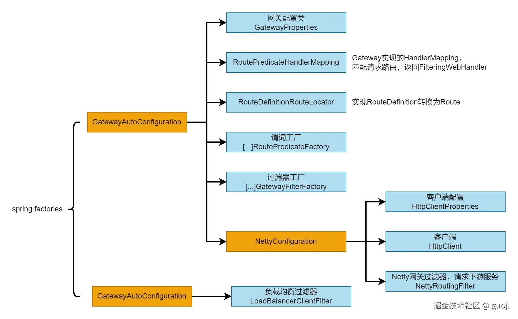 Gateway依赖spring-cloud-gateway-core.jar配置自动装配类GatewayAutoConfiguration和GatewayLoadBalancerClientAutoConfiguration,借助spring.factories文件实现配置发现和解析。