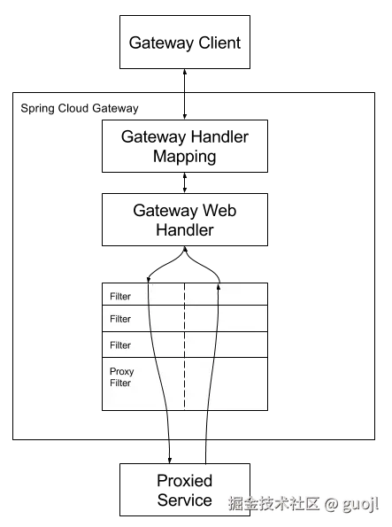 客户端向Spring Cloud Gateway发出请求,如果请求与网关路由匹配,则请求就会被发送到网关Web处理程序,此时处理程序运行特定请求过滤器链。