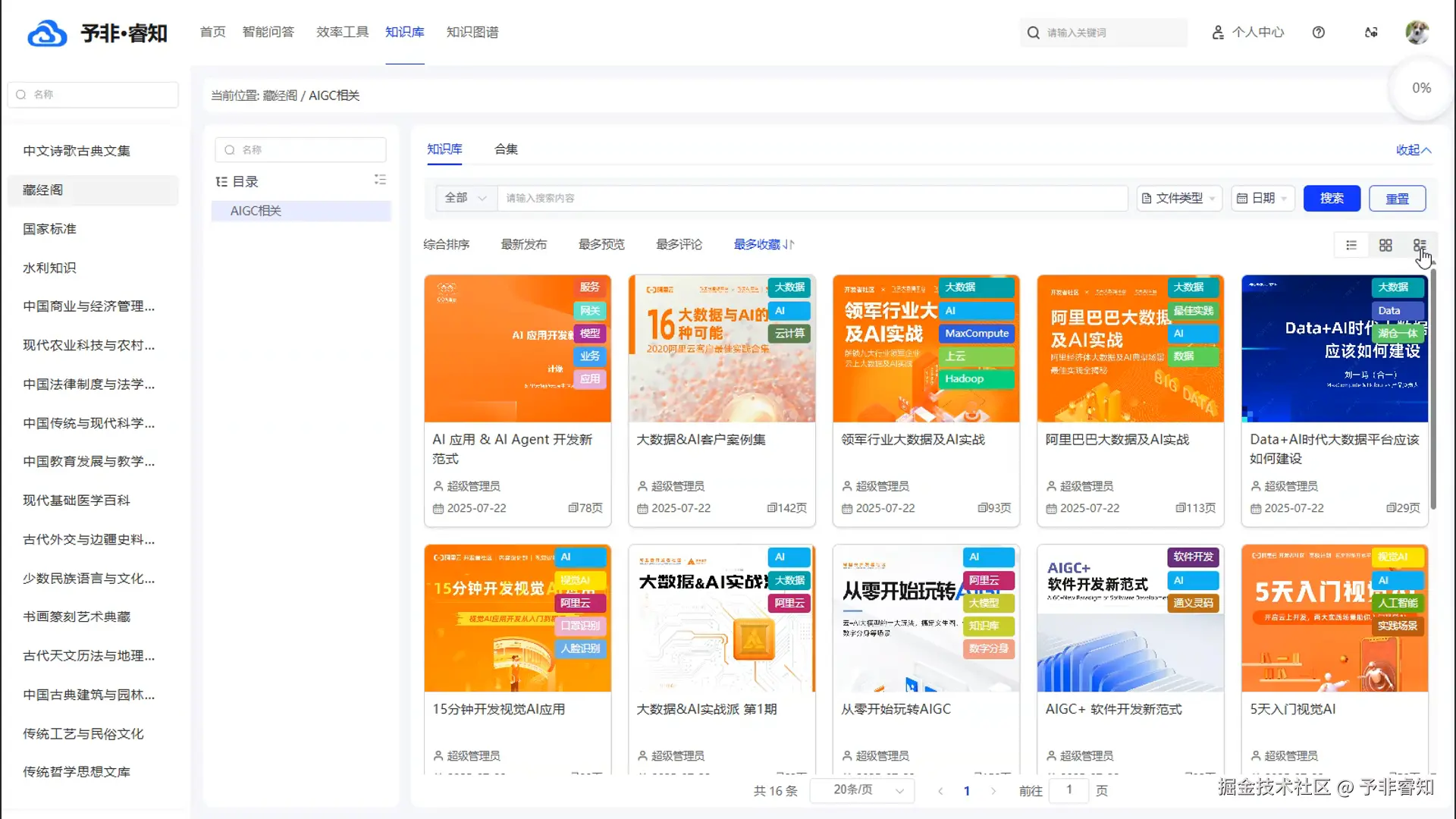 智能化的知识检索与筛选: 产品提供强大的智能搜索功能,用户可以通过输入关键词,快速在海量的知识库中进行检索。同时,系统支持多种筛选和排序方式,例如“综合排序”、“最新发布”、“最多浏览”和“最多收藏”,帮助用户更精准地定位所需信息。